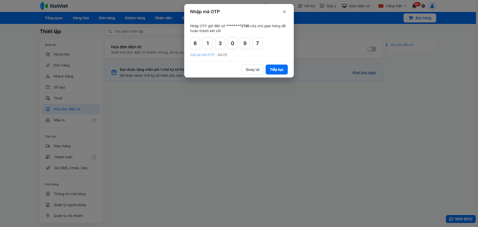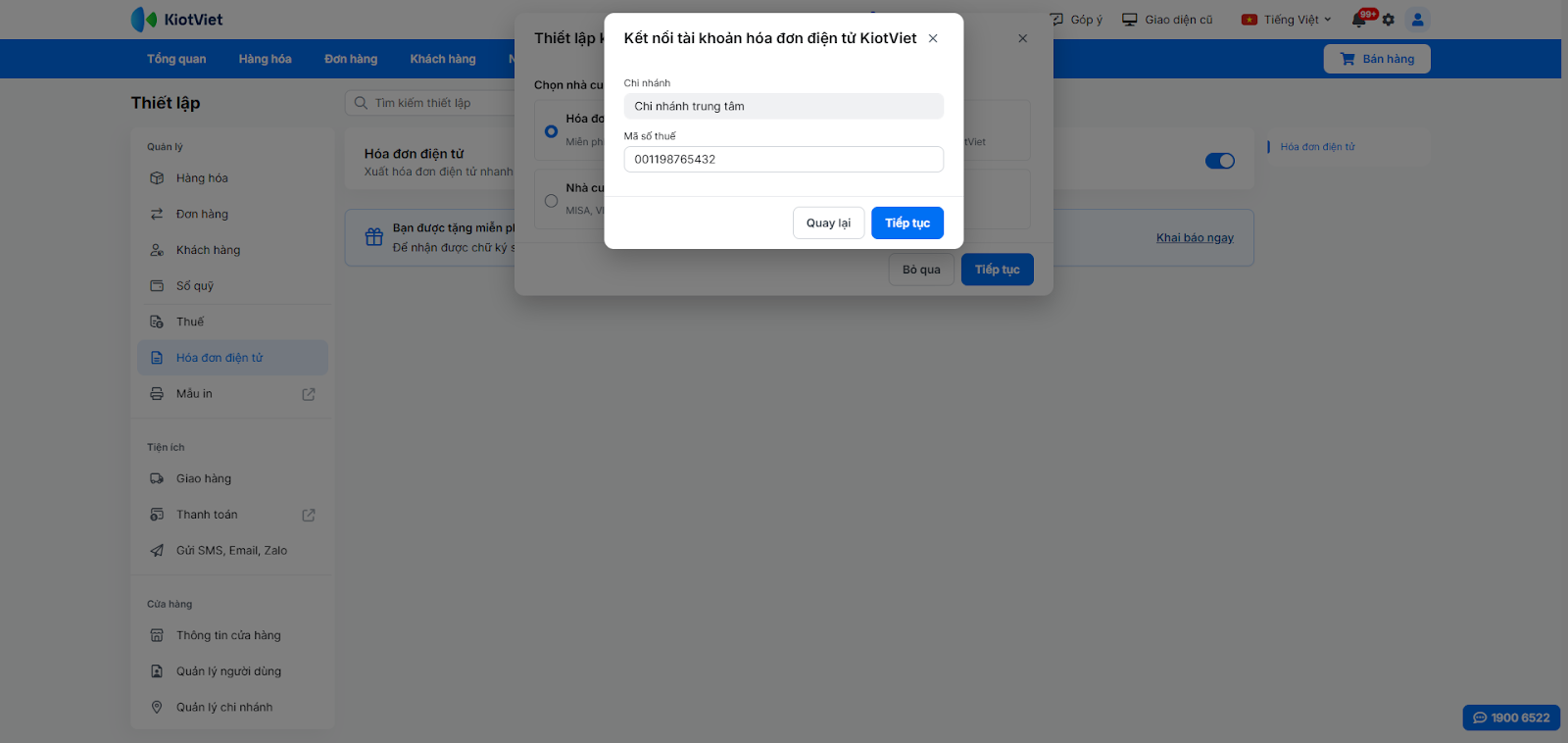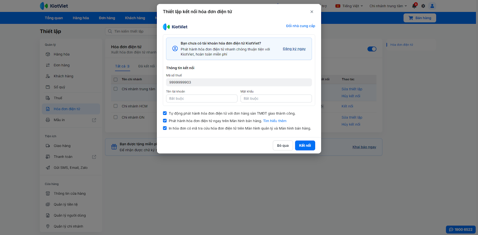 - Bước 7: Kết nối phần mềm QLBH và Phần mềm HĐĐT KiotViet