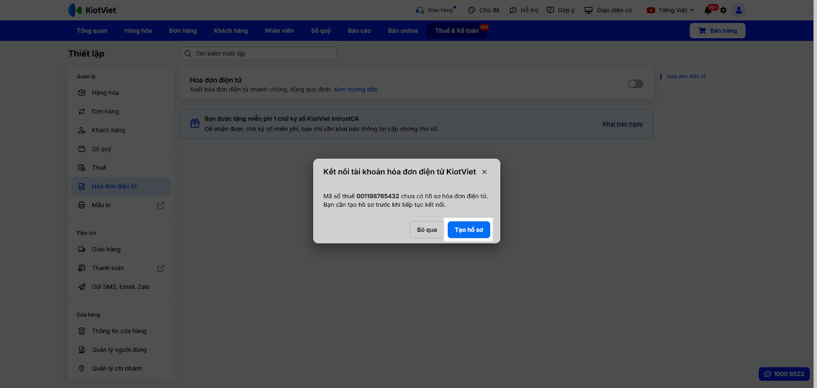 - Tình huống: Bạn là chủ cửa hàng và muốn hệ thống tự động xuất hóa đơn điện tử mỗi khi nhân viên hoàn tất đơn hàng, đảm bảo tuân thủ quy định thuế mà không tốn thêm thao tác thủ công. Bạn cần thực hiện kết nối Mã số thuế của cửa hàng với hệ thống KiotViet.