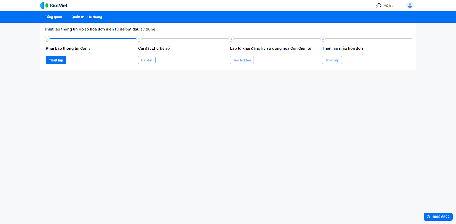 (2) Hệ thống sẽ chuyển hướng bạn sang trang đăng ký Hóa đơn điện tử KiotViet → hoàn tất 4 bước thiết lập hồ sơ theo hướng dẫn trên màn hình.