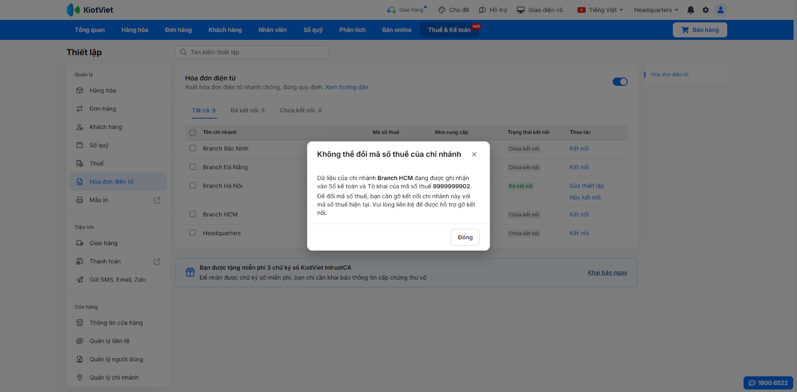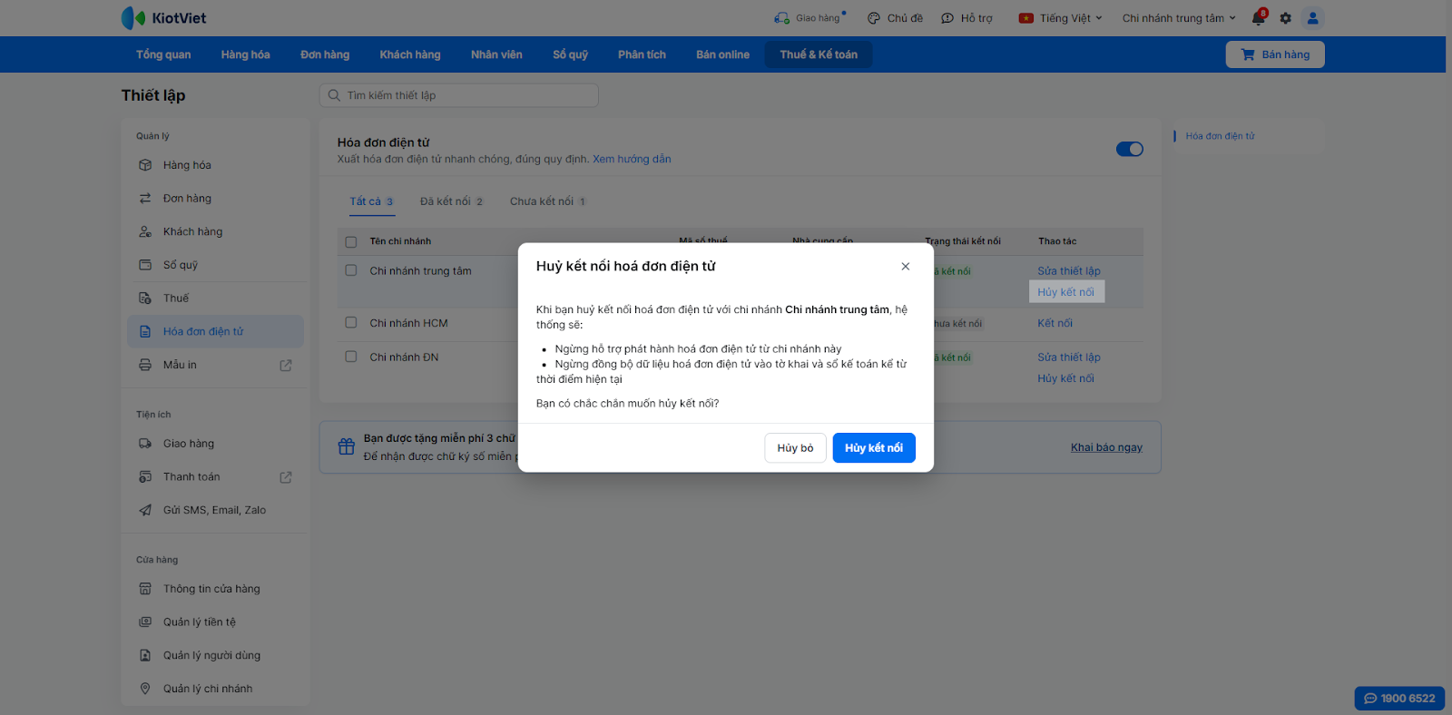 (2) Trong trường hợp này, bạn không thể tự thao tác. Vui lòng liên hệ tổng đài 1900 6522 để được nhân viên KiotViet hỗ trợ gỡ kết nối an toàn, đảm bảo tính toàn vẹn dữ liệu kế toán.