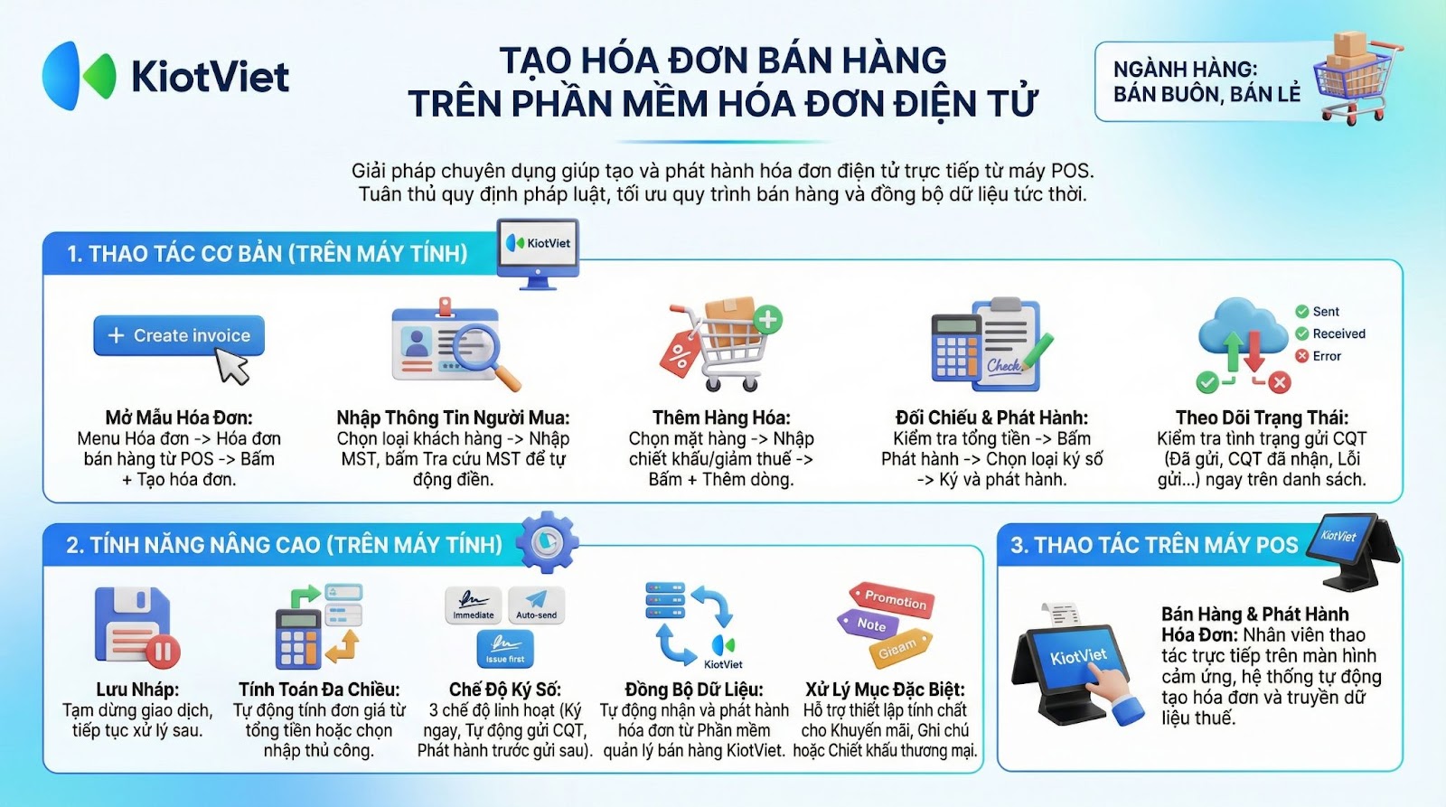- Cách lập: Lập tự động, trực tiếp từ máy POS/phần mềm bán hàng (nhân viên thao tác bán đến đâu hệ thống tự tính tiền, lập hóa đơn và truyền dữ liệu đến đó).