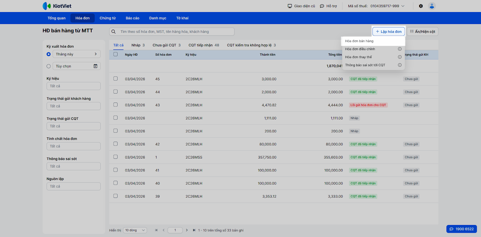 Tính năng này cho phép bạn lập và phát hành hóa đơn bán hàng điện tử trực tiếp trên phần mềm Hóa đơn điện tử KiotViet, được thiết kế đặc thù cho các loại hóa đơn phát sinh từ máy tính tiền (POS). Hóa đơn có thể được tạo thủ công hoặc tiếp nhận tự động từ hệ thống KiotViet, sau đó ký số và gửi lên cơ quan thuế theo đúng quy định pháp luật. Tính năng áp dụng cho người dùng có quyền “Lập hóa đơn Điện tử” trên hệ thống.