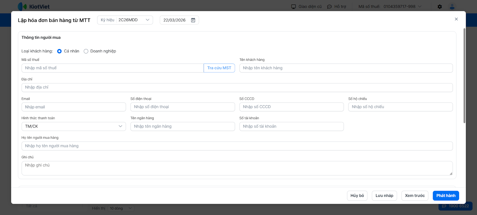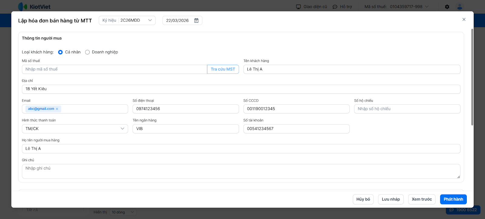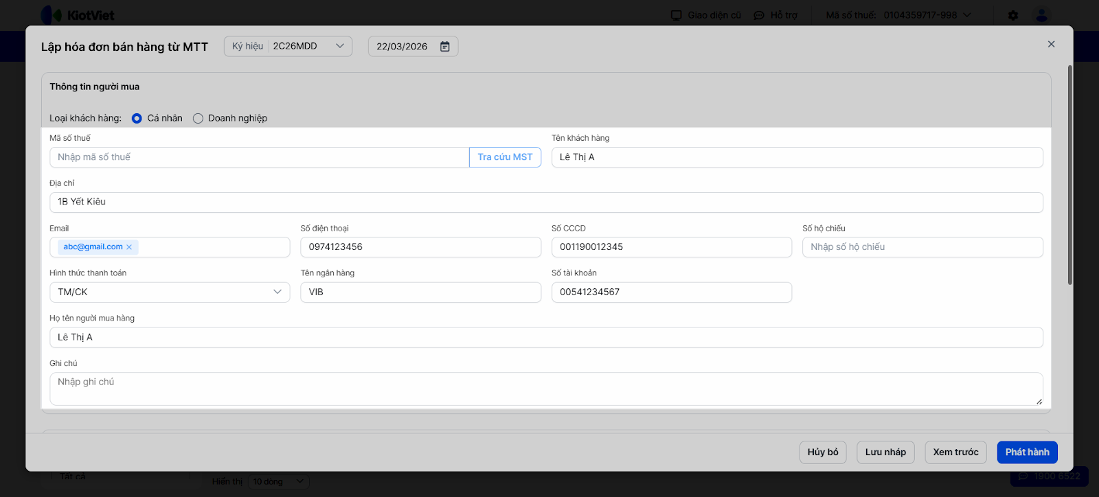 Lưu ý: MST không bắt buộc nếu khách hàng là Cá nhân. Màn hình thao tác sẽ hiển thị trực tiếp trường CCCD và Hộ chiếu để bạn tiện nhập liệu.