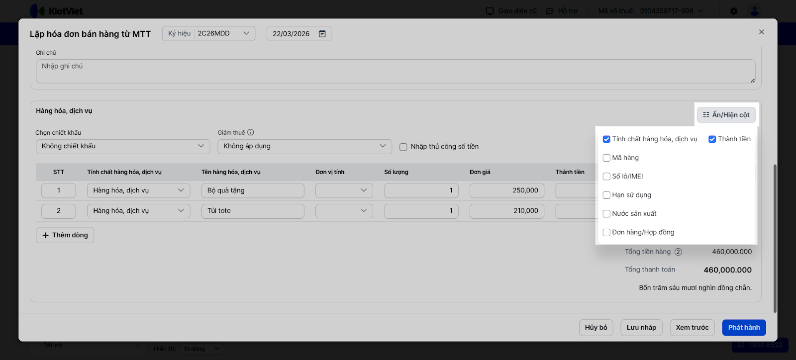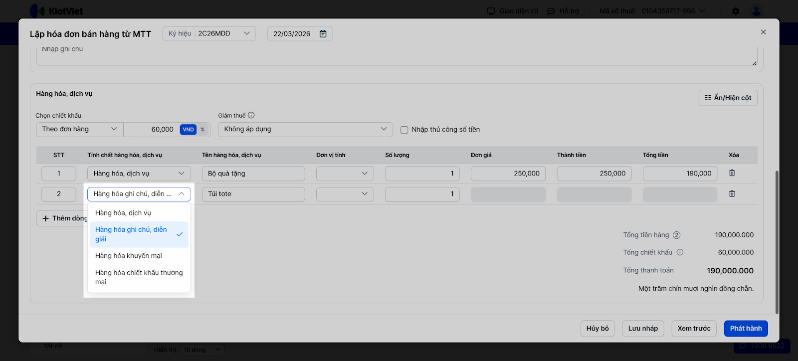 - Lưu ý: Mỗi dòng hàng hóa chỉ được chọn một loại tính chất đặc biệt. Nếu tổng tiền hàng < 0 do chiết khấu thương mại vượt tổng Hàng hóa, dịch vụ → hệ thống hiển thị cảnh báo pháp lý và yêu cầu người dùng xác nhận chịu trách nhiệm trước khi phát hành.