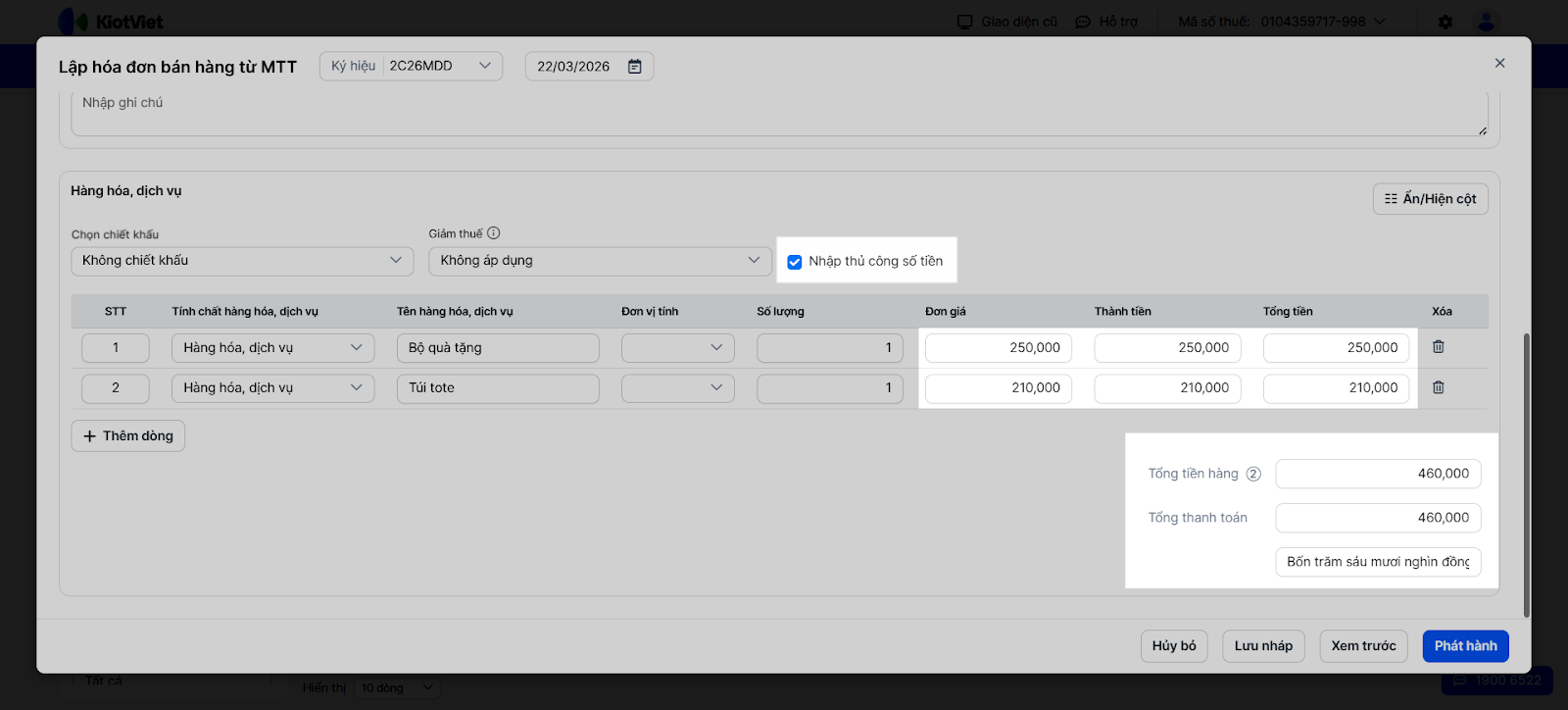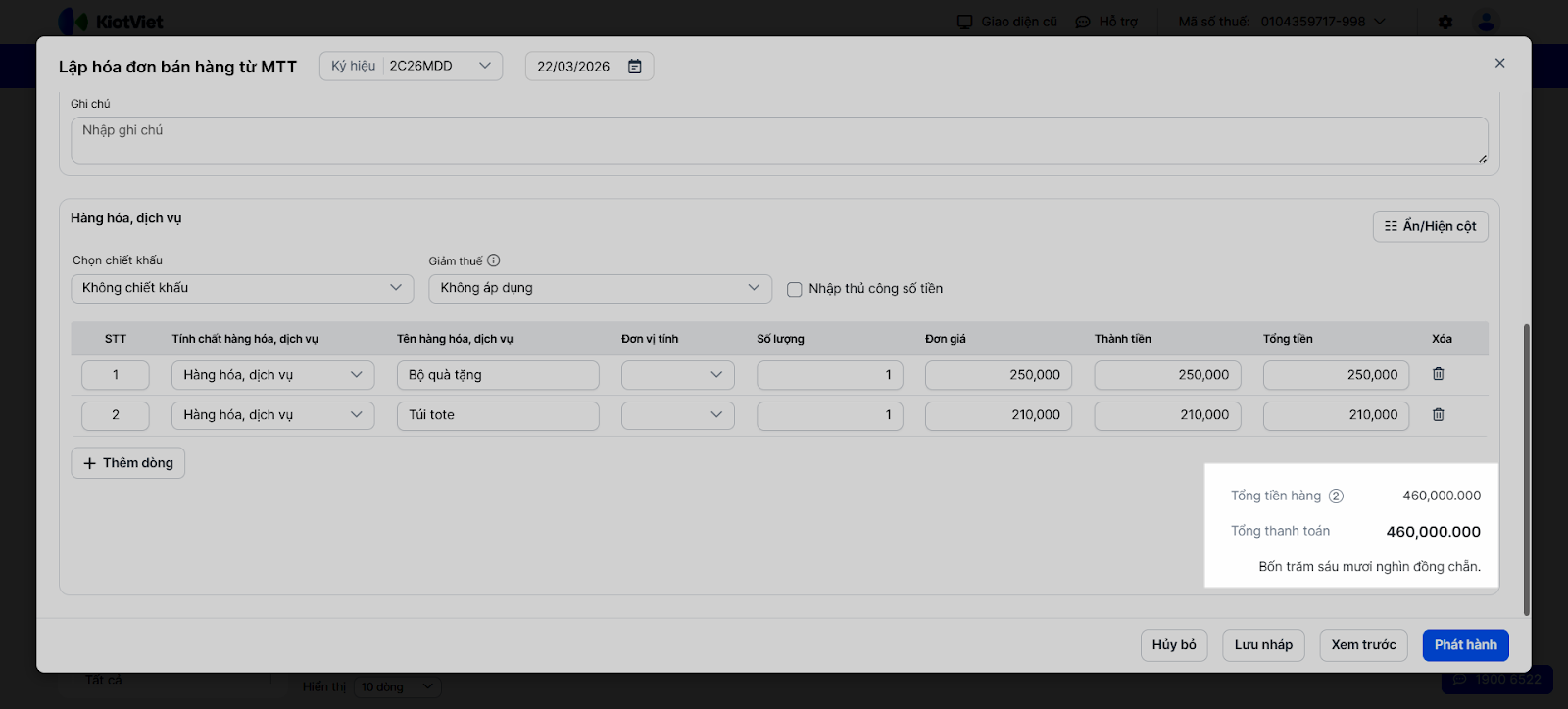 - Tình huống: Hộ kinh doanh cần ghi nhận hàng hóa, dịch vụ vào hóa đơn để hệ thống tính đúng thành tiền, thuế GTGT và tổng thanh toán.