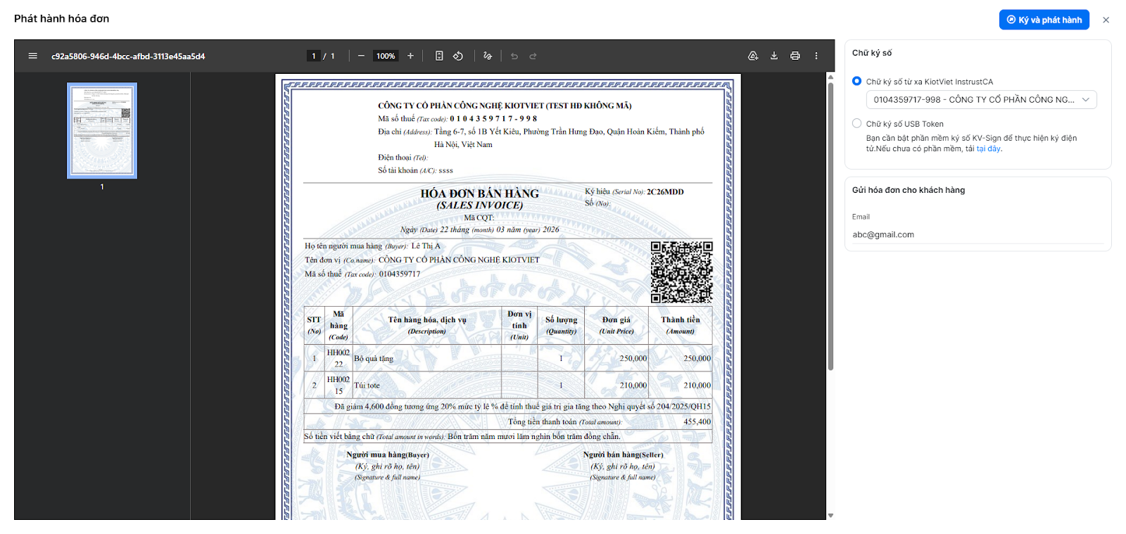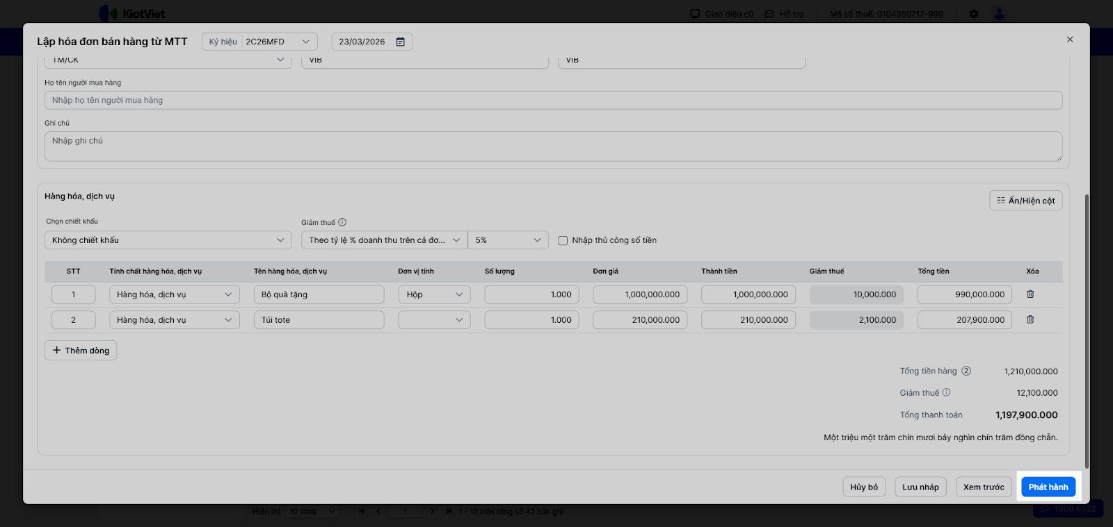 - Nhấn nút Phát hành để mở bản PDF hóa đơn toàn trang.