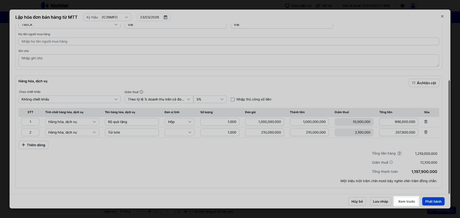 Ngoài ra, nếu chỉ cần xem trước bản PDF hóa đơn, chưa cần phát hành ngay, trên màn hình Lập hóa đơn, bạn có thể nhấn Xem trước.