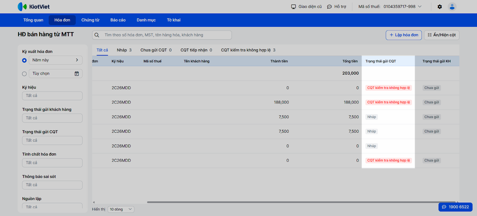 - Nếu quá trình phát hành hóa đơn điện tử/ ký số gặp trục trặc, hệ thống lập tức trả thông báo lỗi về phần mềm Quản lý bán hàng KiotViet để cửa hàng nắm thông tin và xử lý kịp thời.
