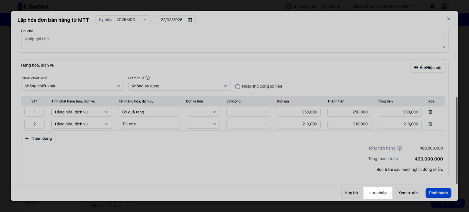 - Trên màn hình Lập hóa đơn → nhấn Lưu nháp.
