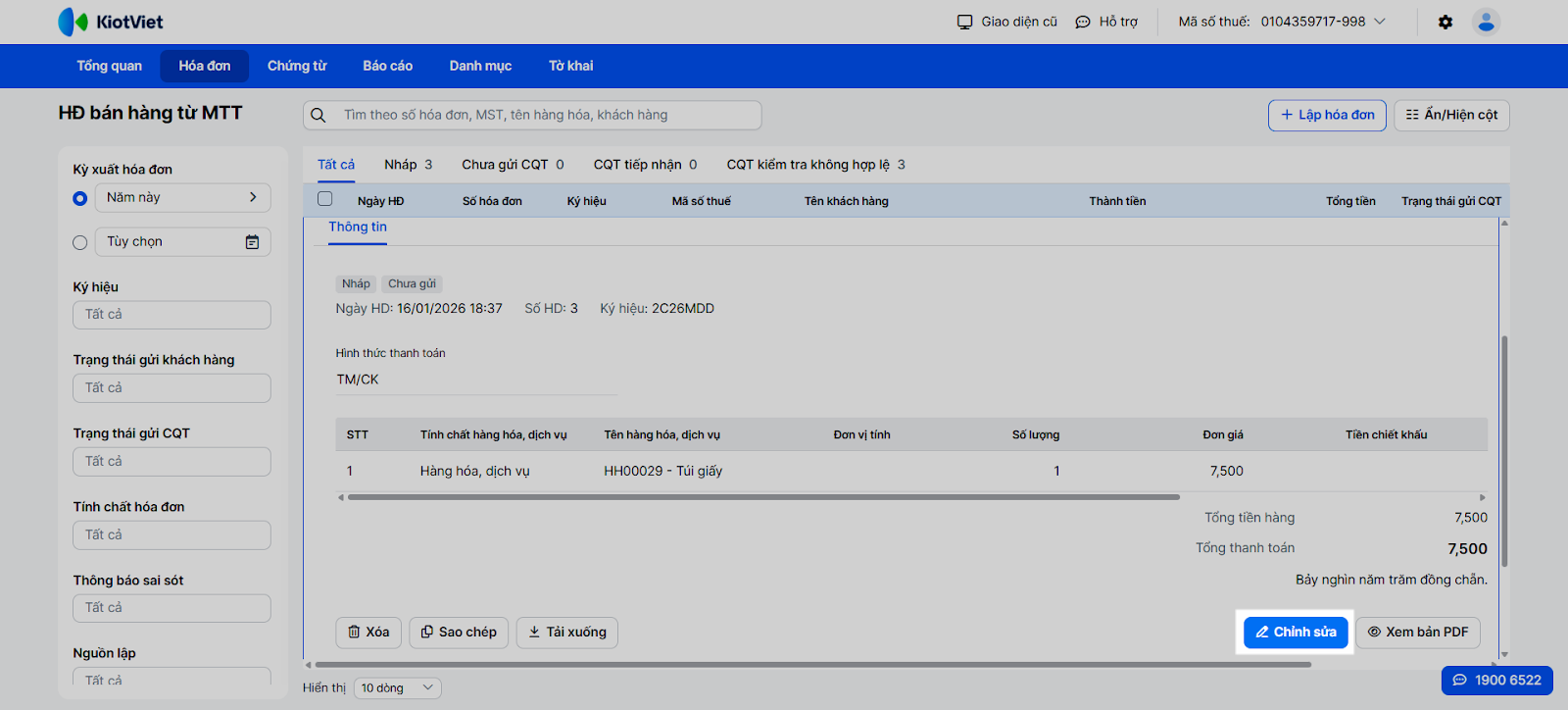 - Khi cần làm tiếp, trên danh sách Hóa đơn giá trị gia tăng, bạn nhấn vào hóa đơn để mở chi tiết → nhấn Chỉnh sửa để hoàn thiện và phát hành hóa đơn.