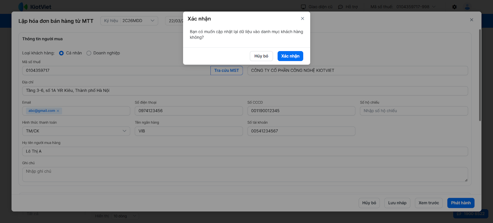 - Nếu sửa thông tin sau khi đã chọn từ danh mục, khi phát hành hoặc lưu nháp hệ thống hỏi: Bạn có muốn cập nhật lại dữ liệu vào danh mục khách hàng không? → chọn Xác nhận nếu muốn cập nhật lại hoặc Hủy bỏ nếu không cần cập nhật lại dữ liệu trong danh mục khách hàng.