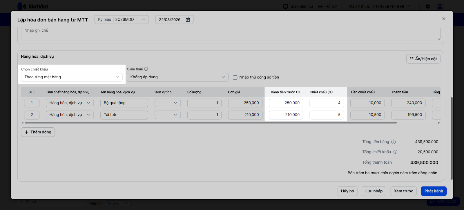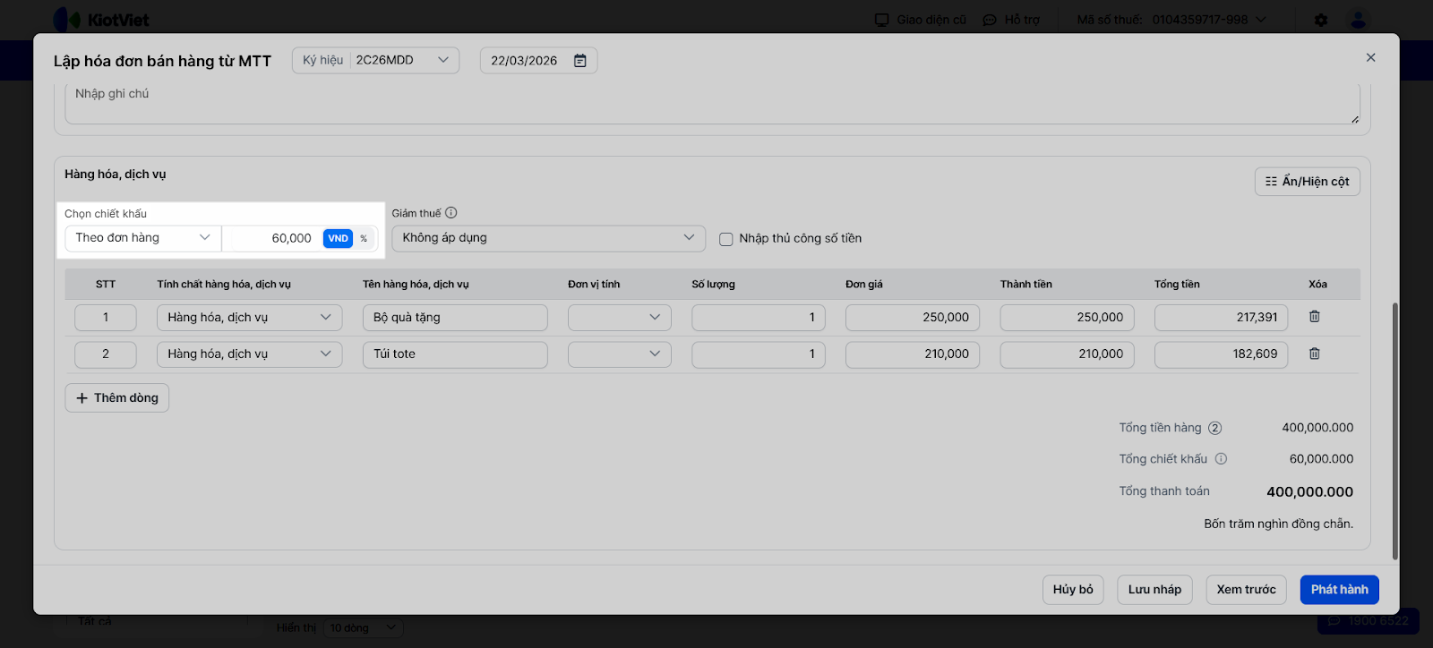 - Tình huống: Hộ kinh doanh của bạn triển khai các chương trình giảm giá cho hàng hóa và đơn hàng.