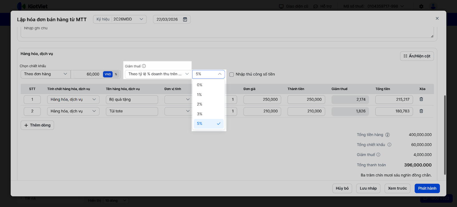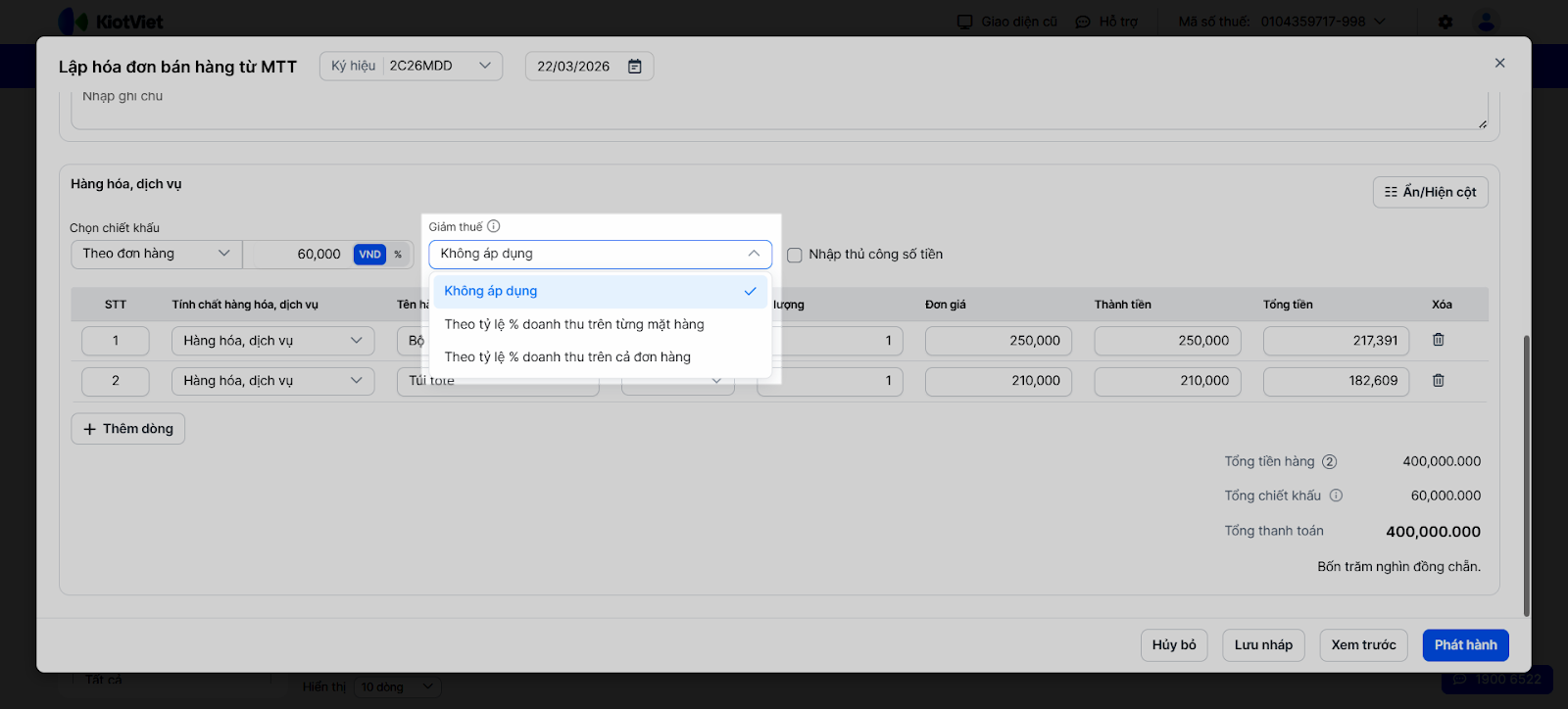 - Giảm thuế: Hệ thống mặc định Không áp dụng, bạn chọn loại giảm thuế Theo tỷ lệ % doanh thu theo từng mặt hàng hoặc trên cả đơn hàng nếu có.