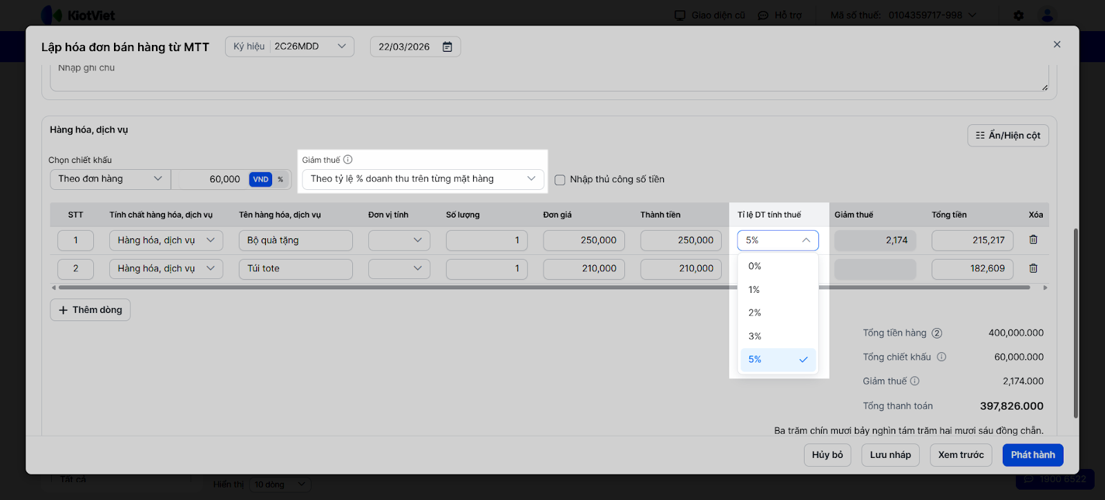 - Chọn loại giảm thuế tương ứng: Không áp dụng giảm thuế / Theo tỷ lệ % doanh thu trên từng mặt hàng / Theo tỷ lệ % doanh thu trên cả đơn hàng.