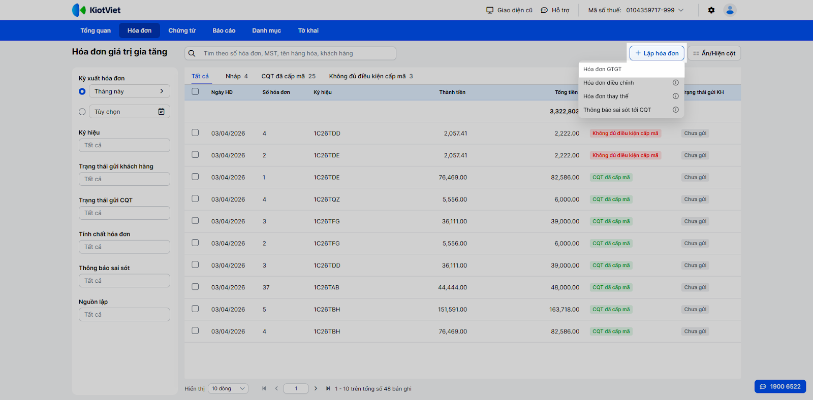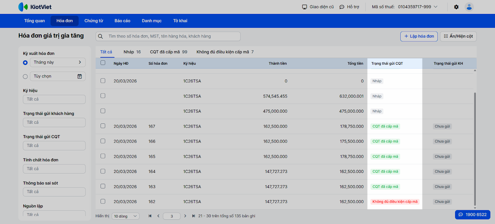 - Tuân thủ pháp lý tự động: Hóa đơn được lập đúng mẫu theo quy định, tự động tính thuế GTGT, kiểm tra điều kiện cấp mã CQT và phân loại trạng thái gửi CQT (Đã cấp mã / Không đủ điều kiện cấp mã / Đã gửi CQT).
