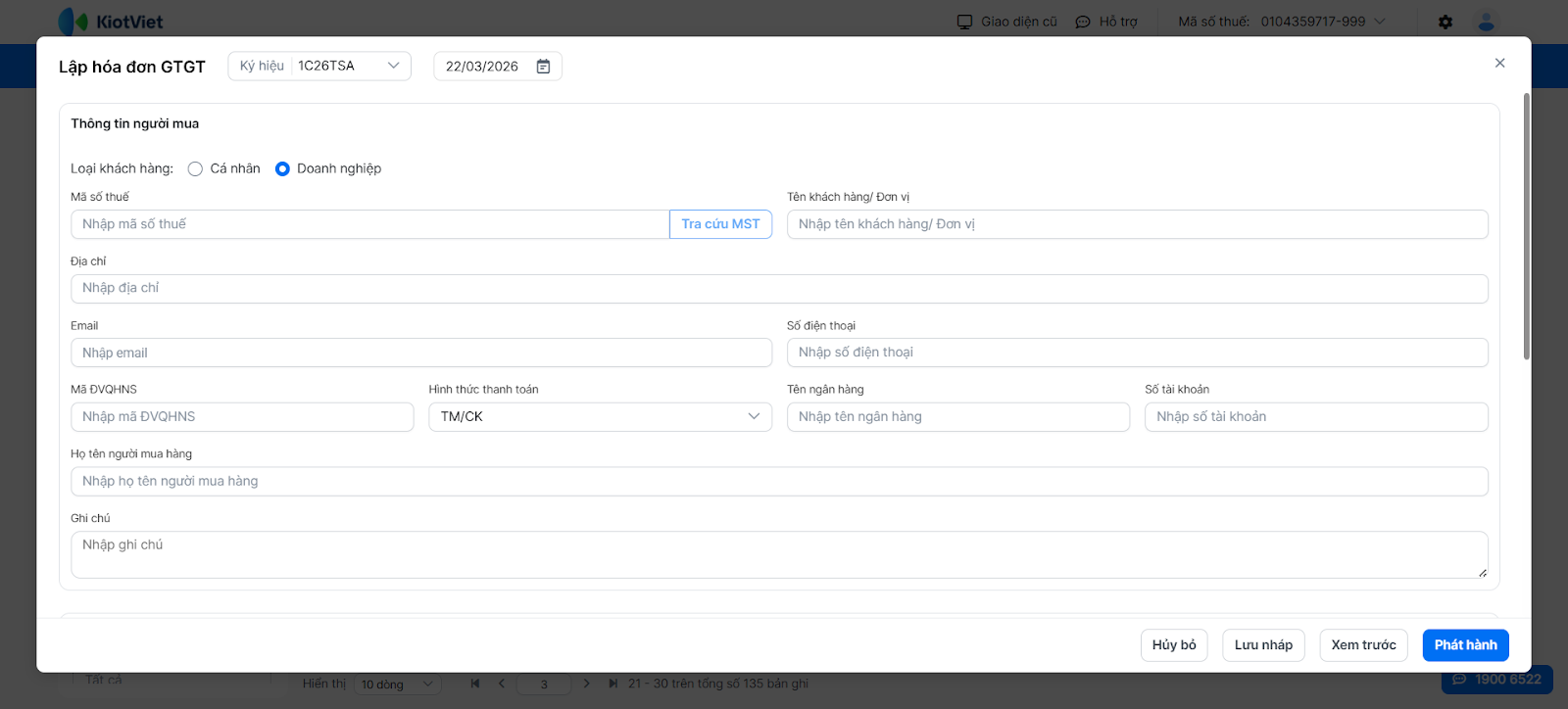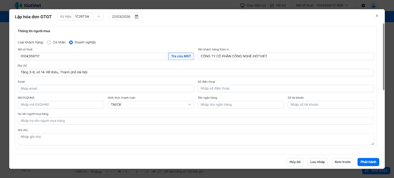 - Tra cứu MST: Khi lập hóa đơn, bạn nhập Mã số thuế và nhấn Tra cứu MST → hệ thống tự động điền Tên khách hàng và Địa chỉ từ Tổng cục Thuế.