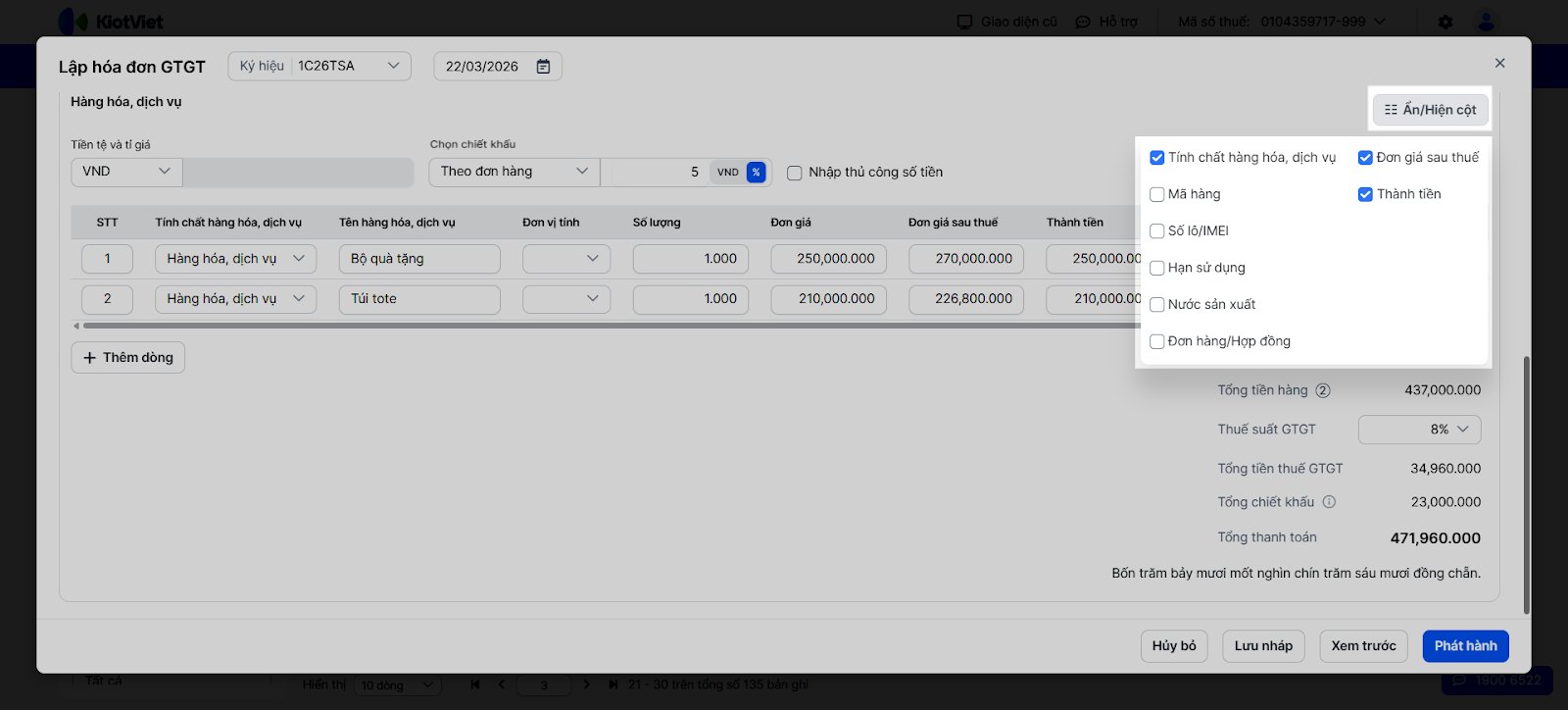 Lưu ý: Bạn có thể tùy chỉnh ẩn/hiện các cột thông tin bằng cách nhấn Ẩn/Hiện cột → tích/bỏ chọn các cột muốn hiển thị/ẩn trên màn hình.