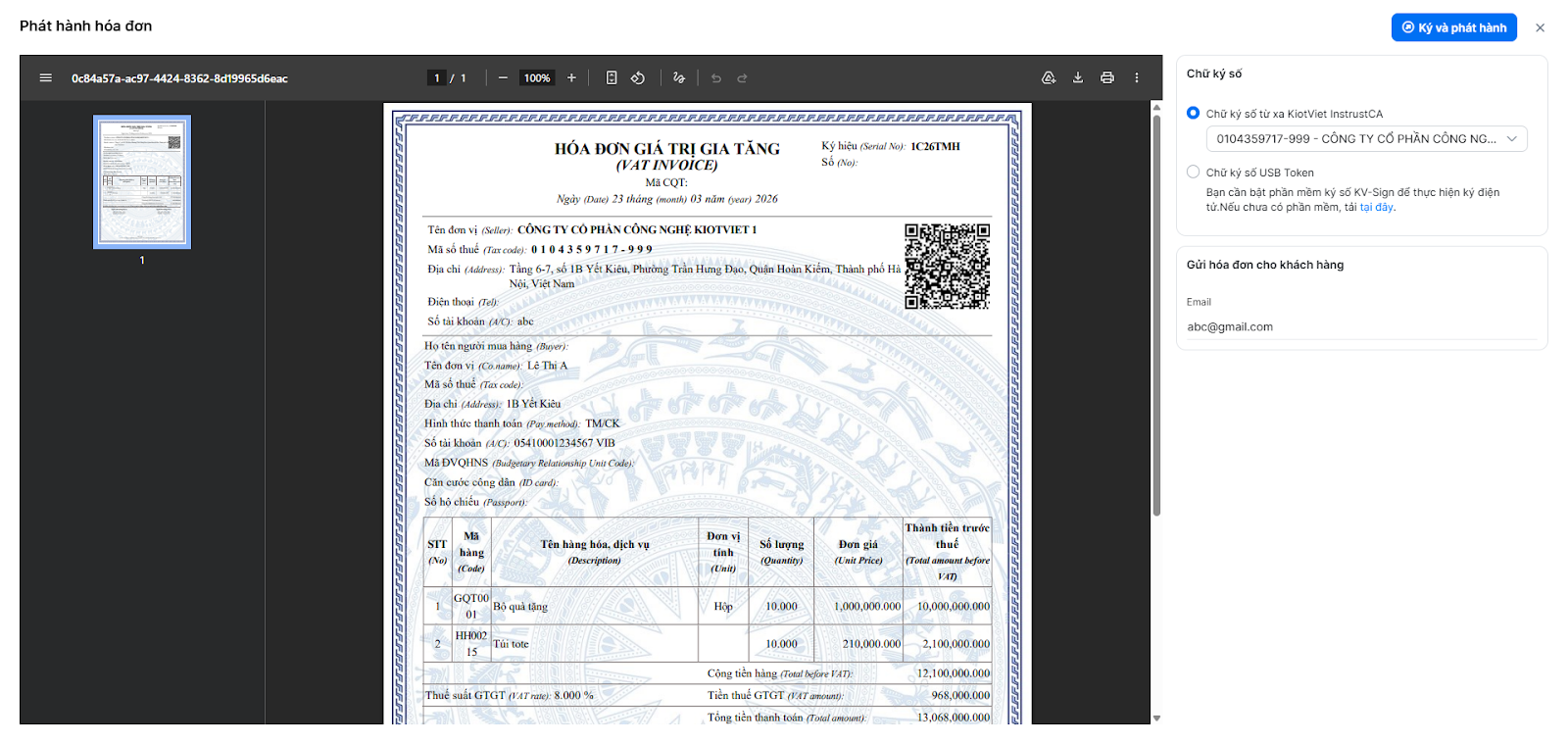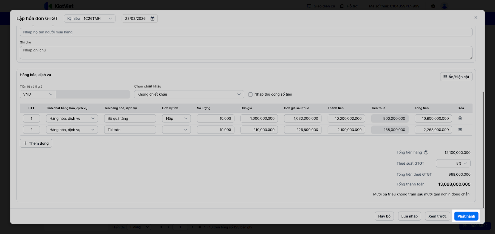 - Nhấn nút Phát hành để mở bản PDF hóa đơn toàn trang.