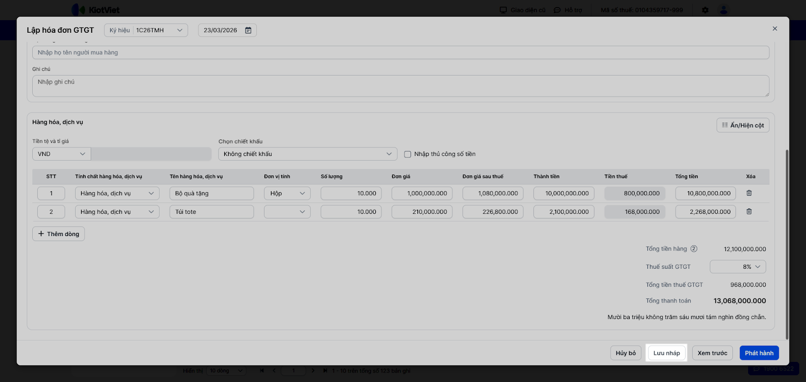 - 1. Lưu nháp hóa đơn