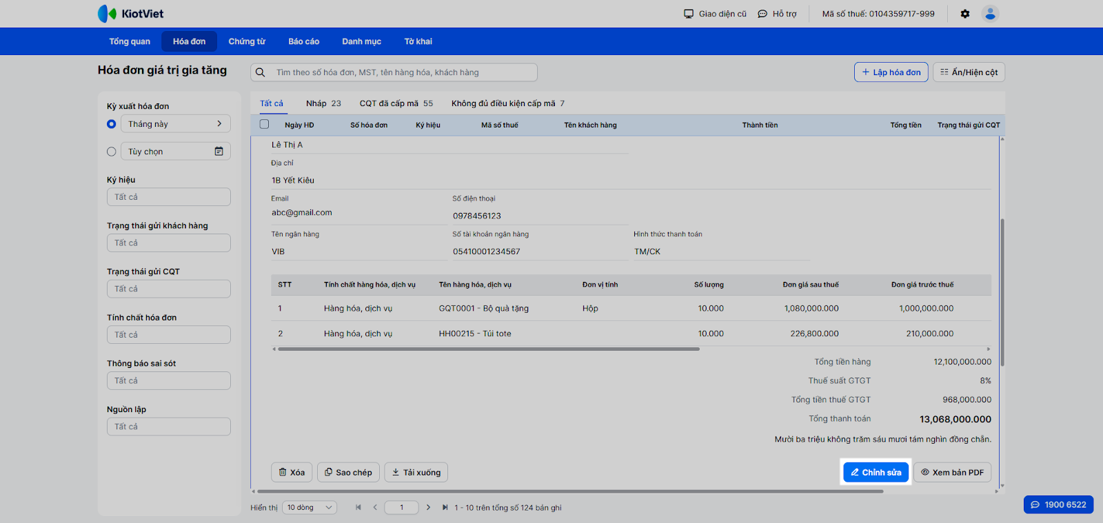 - Khi cần làm tiếp, trên danh sách Hóa đơn giá trị gia tăng, bạn nhấn vào hóa đơn để mở chi tiết → nhấn Chỉnh sửa để hoàn thiện và phát hành hóa đơn.