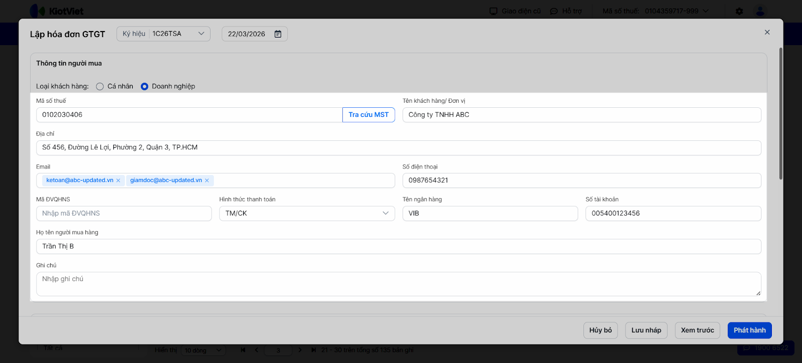 - Kiểm tra và bổ sung các trường còn lại: Địa chỉ, Email, Số điện thoại, Hình thức thanh toán, Tên ngân hàng, Số tài khoản.