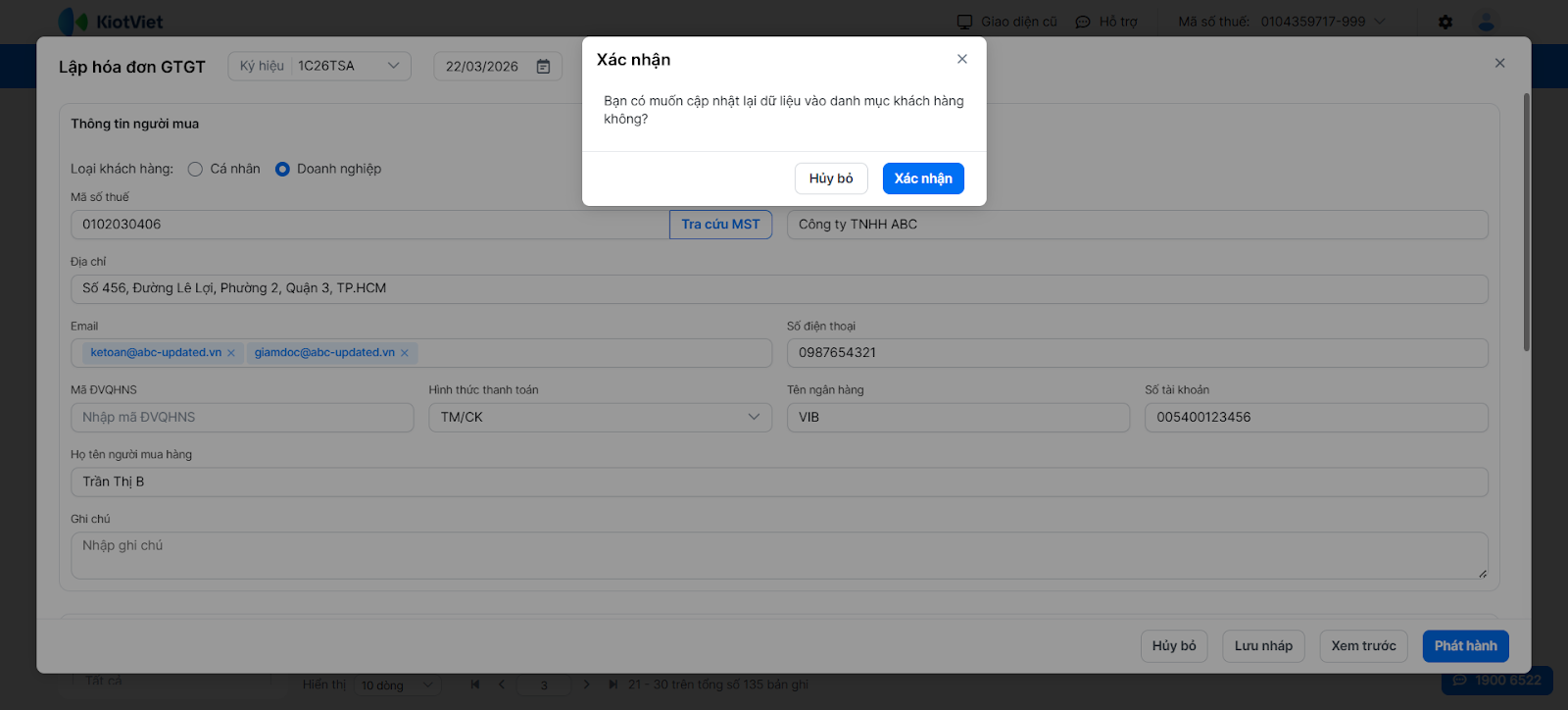 - Nếu sửa thông tin sau khi đã chọn từ danh mục, khi phát hành hoặc lưu nháp hệ thống hỏi: Bạn có muốn cập nhật lại dữ liệu vào danh mục khách hàng không? → chọn Xác nhận nếu muốn cập nhật lại hoặc Hủy bỏ nếu không cần cập nhật lại dữ liệu trong danh mục khách hàng.