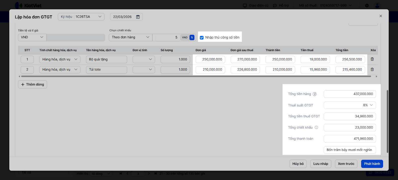 - Khi nhập Tổng tiền và sau đó thay đổi VAT% → hệ thống giữ nguyên Tổng tiền và tính lại Thành tiền, Tiền thuế, Đơn giá theo VAT mới.