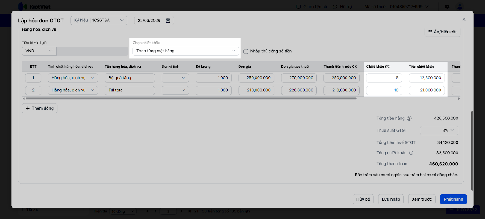 - Lưu ý: Tiền thuế GTGT luôn được tính từ thành tiền sau khi đã trừ chiết khấu (áp dụng cho cả chiết khấu theo hàng hóa và theo đơn hàng).