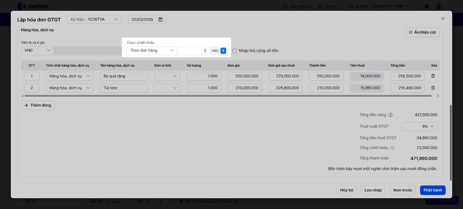 - Hoặc chiết khấu Theo đơn hàng → nhập giá trị chiết khấu theo VND hoặc % → hệ thống phân bổ chiết khấu vào từng dòng hàng hóa theo tỉ lệ thành tiền, sau đó tính VAT và Tổng tiền.