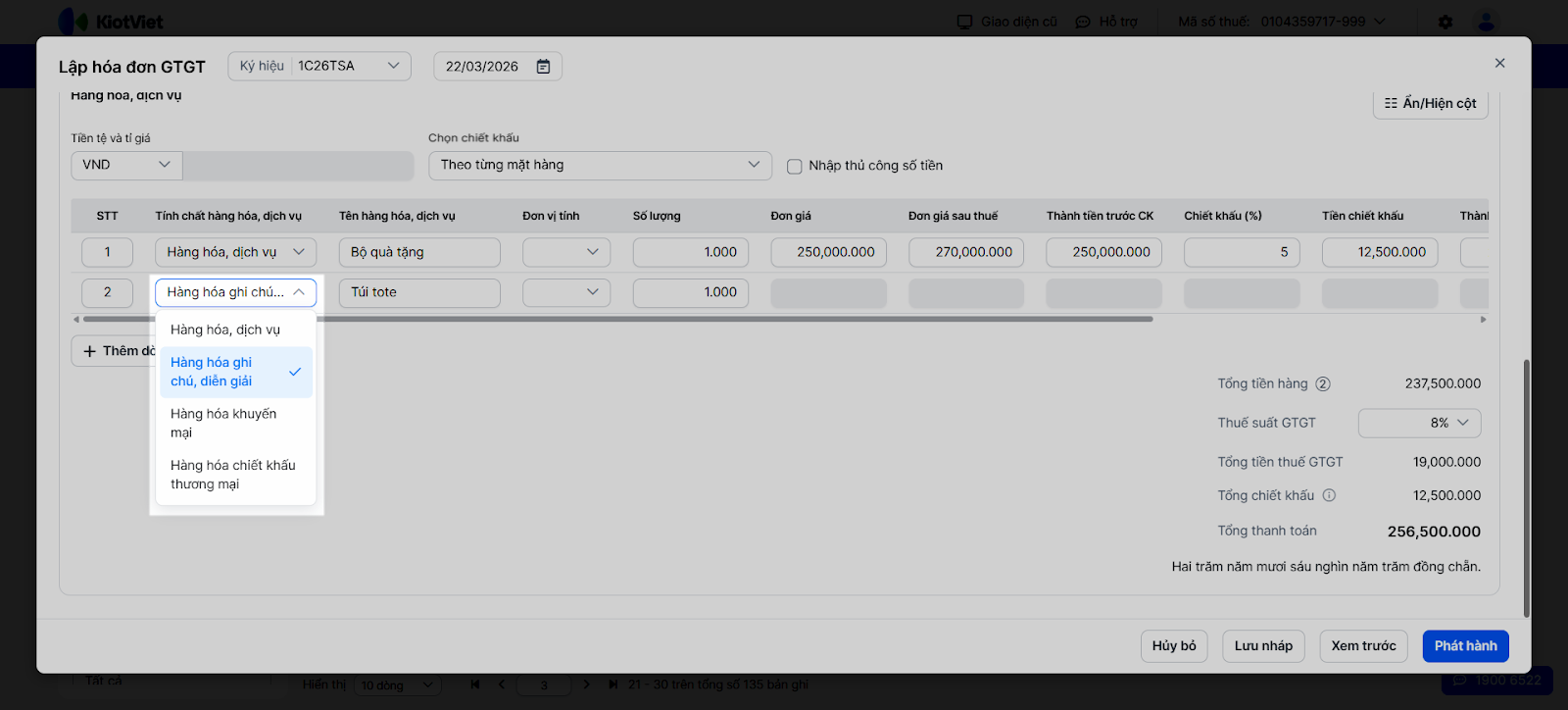 - Lưu ý: Mỗi dòng hàng hóa chỉ được chọn một loại tính chất đặc biệt. Nếu tổng tiền hàng < 0 do chiết khấu thương mại vượt tổng Hàng hóa, dịch vụ → hệ thống hiển thị cảnh báo pháp lý và yêu cầu người dùng xác nhận chịu trách nhiệm trước khi phát hành.