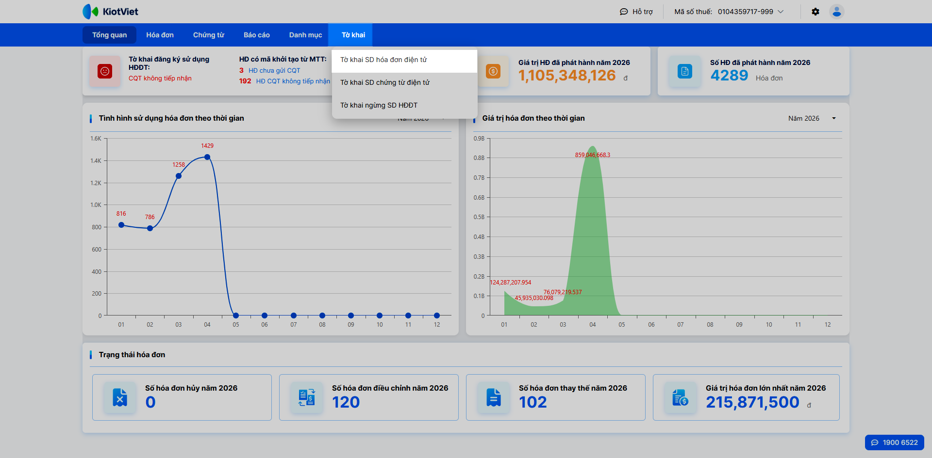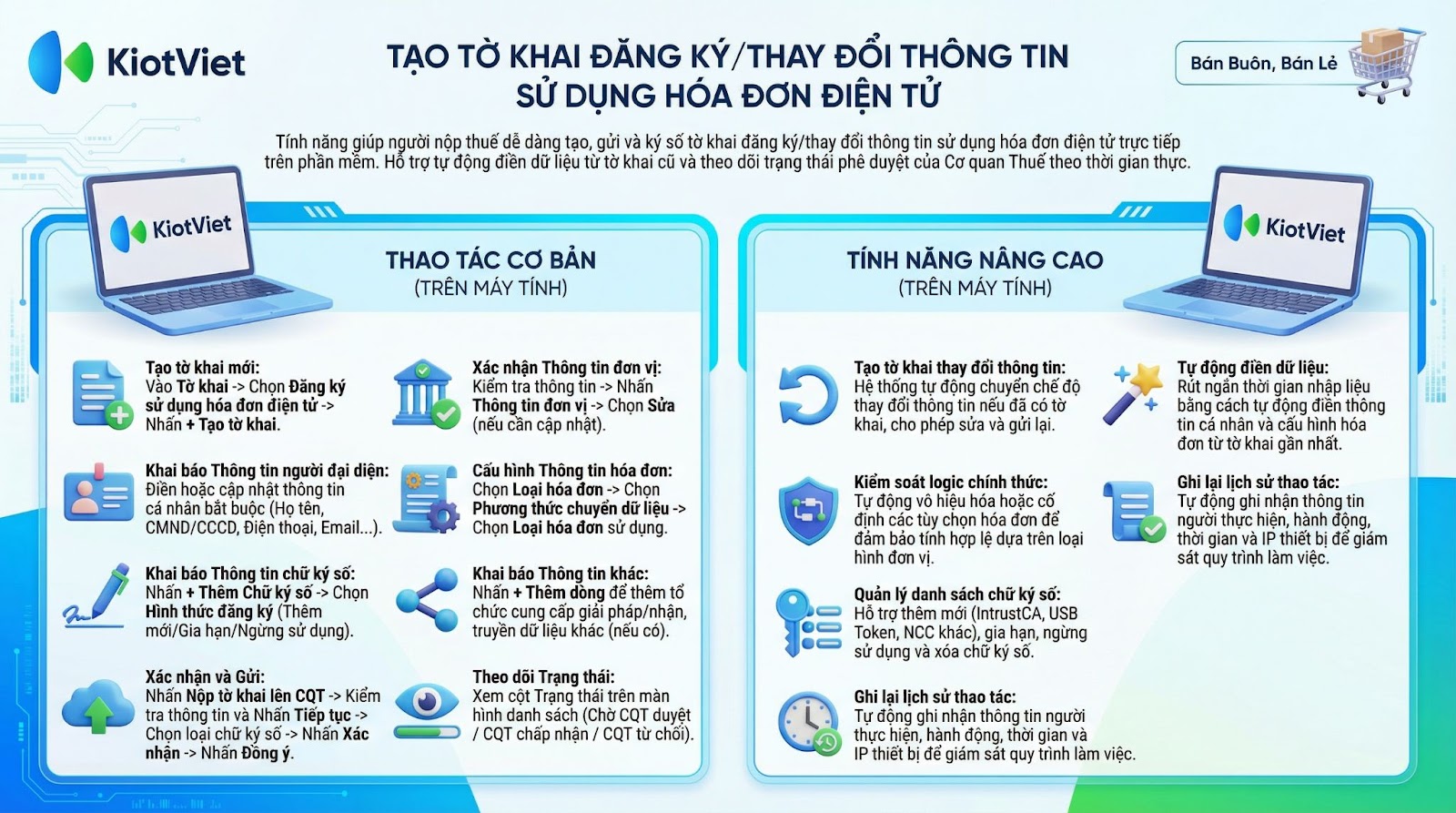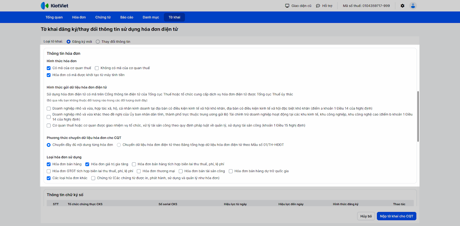 Tính năng này cho phép người nộp thuế lập và nộp tờ khai đăng ký hoặc thay đổi thông tin sử dụng hóa đơn điện tử (Mẫu số 01/ĐKTĐ-HĐĐT – Phụ lục IA ban hành kèm theo Nghị định 70/2025/NĐ-CP) trực tiếp trên phần mềm KiotViet (tích hợp trên KiotViet eInvoice). Tờ khai sẽ được ký số điện tử và gửi lên Cơ quan Thuế (CQT). Đây là bước bắt buộc trước khi cửa hàng, doanh nghiệp có thể bắt đầu phát hành hóa đơn điện tử hợp lệ, hoặc khi có bất kỳ thay đổi nào về thông tin đã đăng ký.