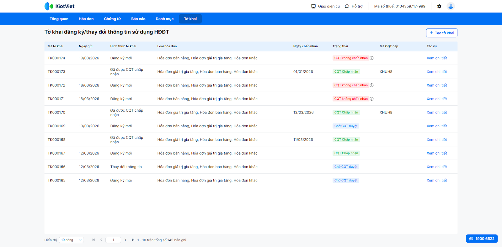 - Hệ thống hiển thị màn hình danh sách Tờ khai đăng ký/thay đổi thông tin sử dụng HĐĐT.