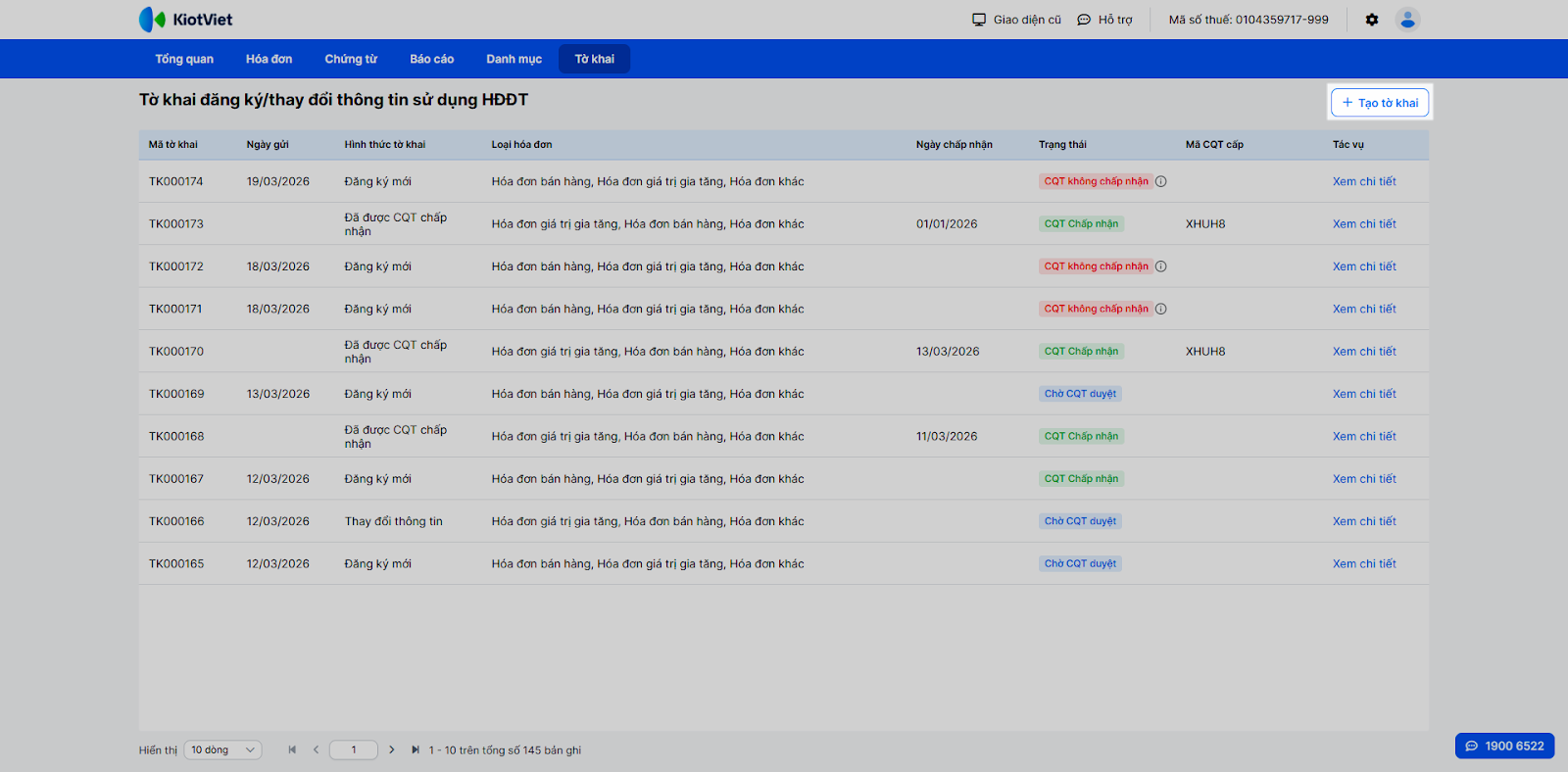 - Tình huống: Cửa hàng của bạn vừa chuyển sang sử dụng Hóa đơn điện tử (HĐĐT), bạn cần mở màn hình trên KiotViet để tạo tờ khai mới gửi Cơ quan Thuế.