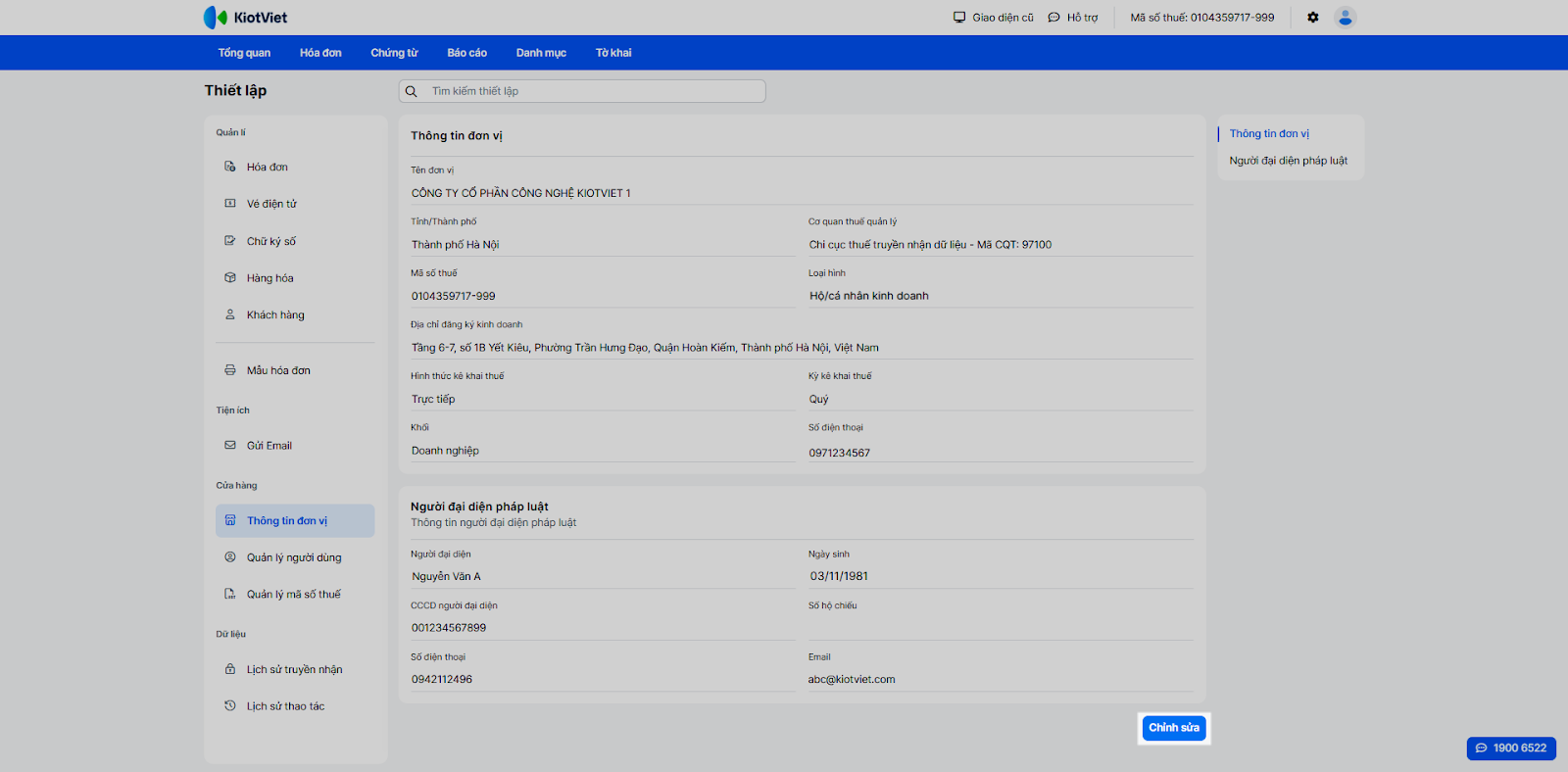 - Hệ thống chuyển sang màn hình Thiết lập → Thông tin đơn vị, bạn nhấn Chỉnh sửa để cập nhật hồ sơ, sau đó quay lại để tiếp tục tạo tờ khai.