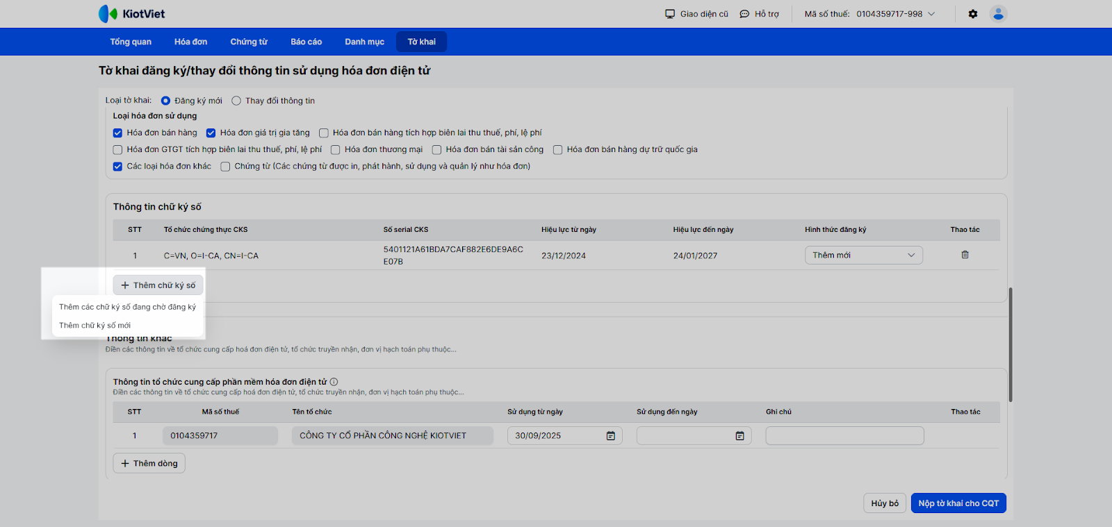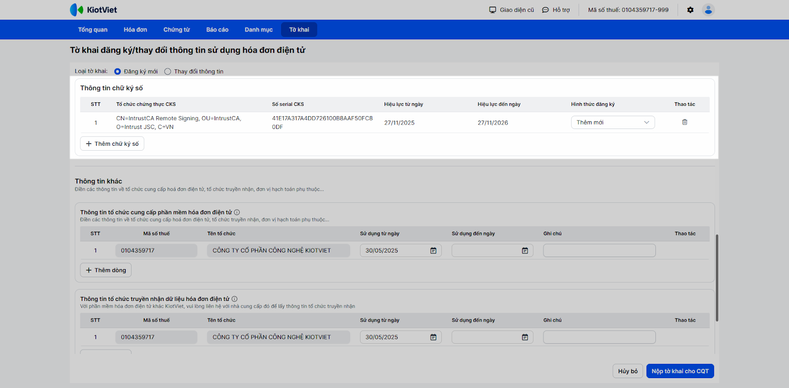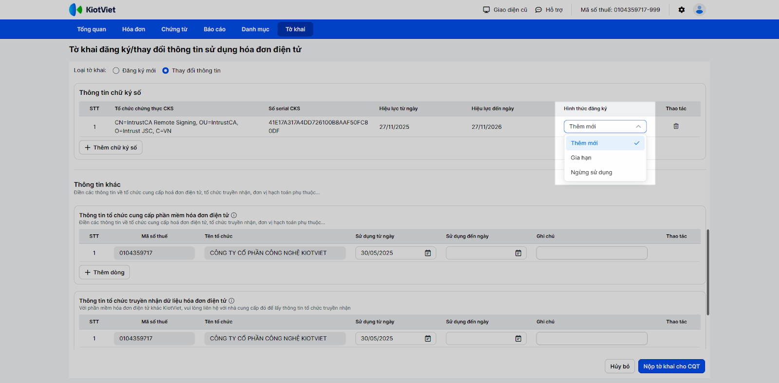 - Thêm mới: Khi CKS chưa từng được khai báo với cơ quan Thuế trước đó.