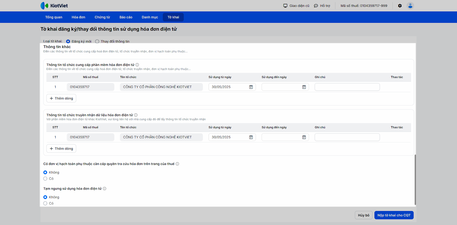 - Kiểm tra bảng Thông tin tổ chức cung cấp phần mềm hóa đơn điện tử và Thông tin tổ chức truyền nhận dữ liệu hóa đơn điện tử.