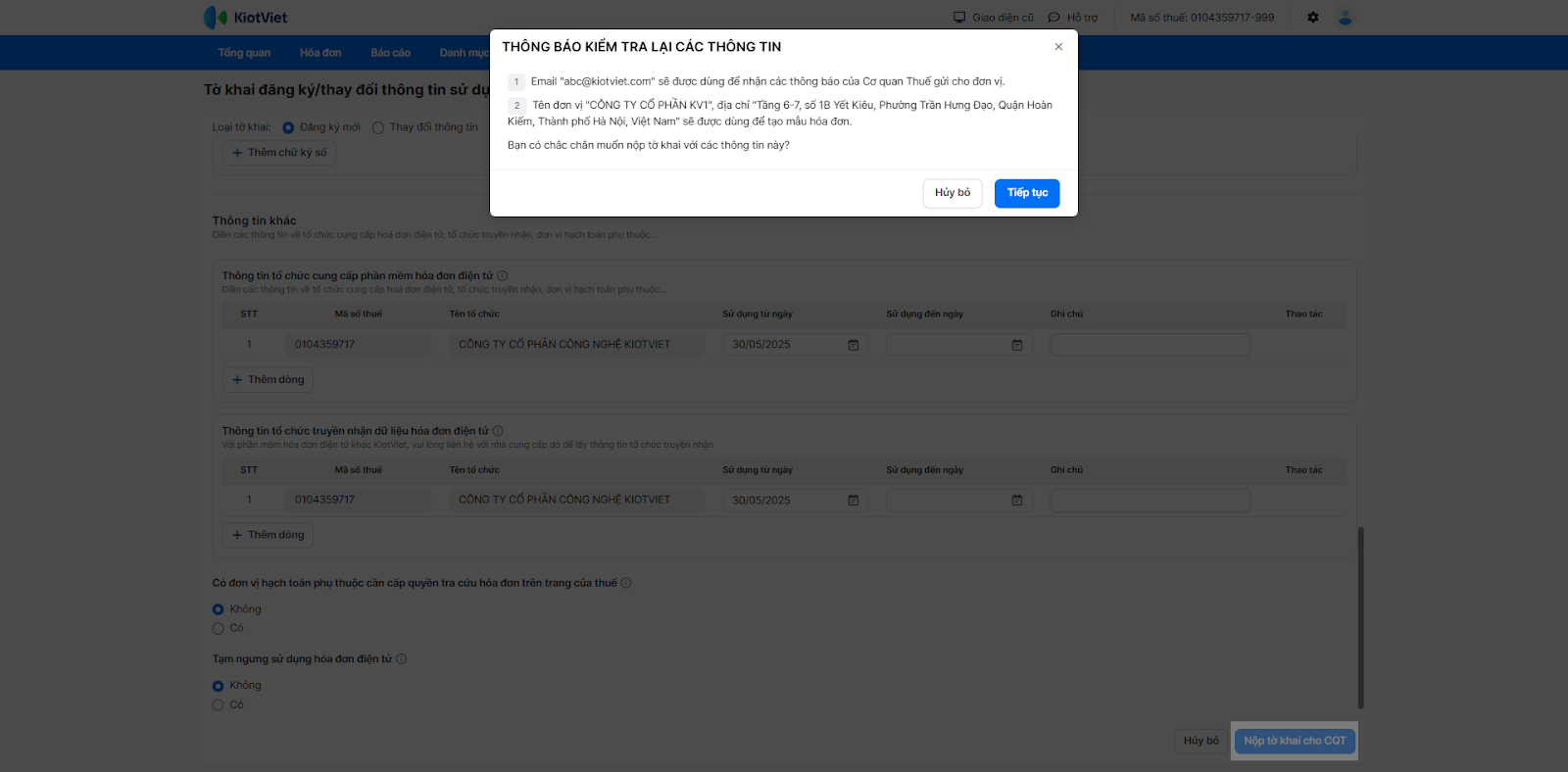 - Bạn rà soát lại Email và Tên đơn vị một lần nữa, sau đó nhấn Tiếp tục.