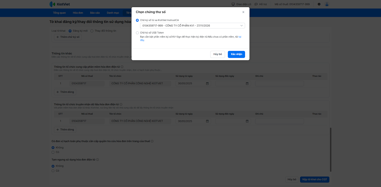- Chọn loại CKS cửa hàng đang dùng (IntrustCA hoặc USB Token) và nhấn Xác nhận.