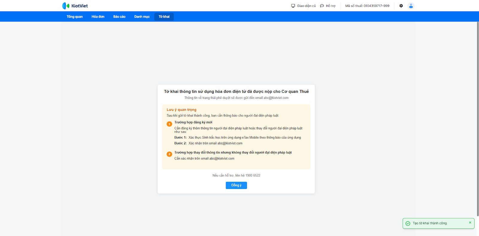 - Nhấn Đồng ý tại màn hình thông báo thành công để quay về danh sách quản lý tờ khai.