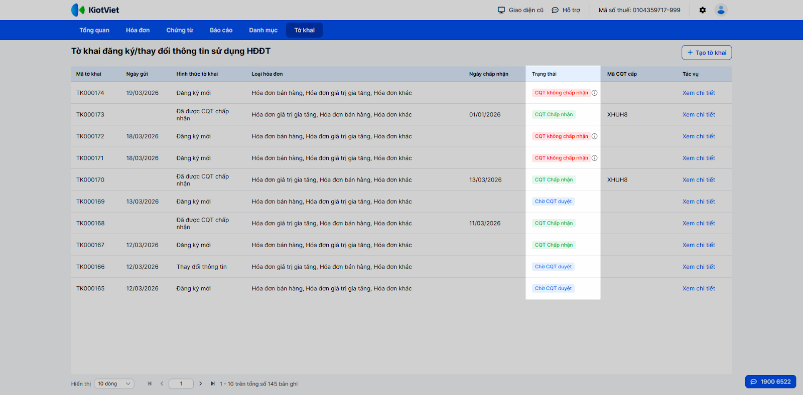 - Tại màn hình danh sách tờ khai, theo dõi cột Trạng thái (Chờ CQT duyệt/CQT Chấp nhận/CQT không chấp nhận).