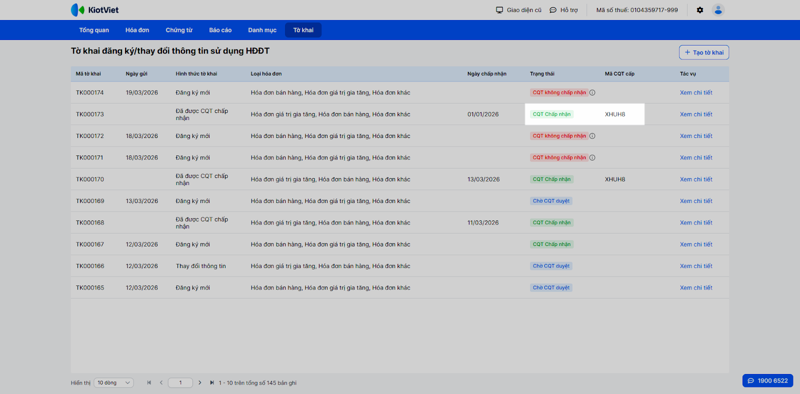 - Khi trạng thái chuyển thành CQT Chấp nhận, bạn kiểm tra Mã CQT cấp nếu đăng ký sử dụng hóa đơn khởi tạo từ máy tính tiền để dùng cho việc cấu hình phát hành hóa đơn.