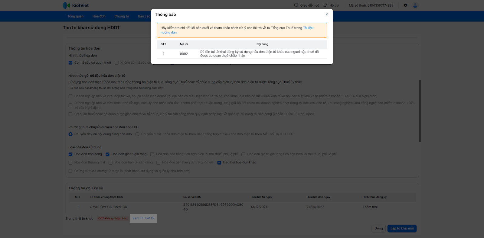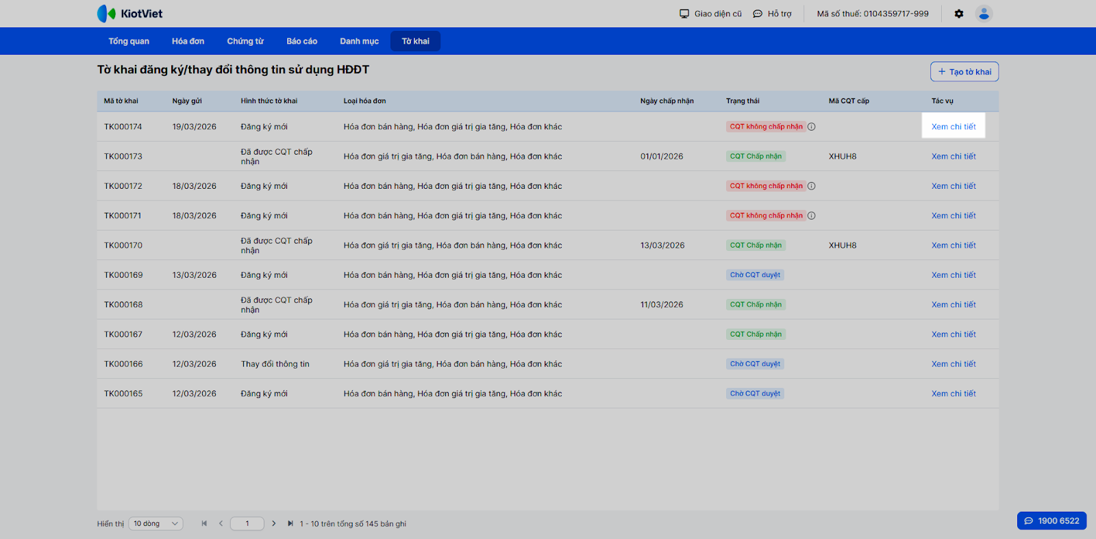 - Nếu trạng thái là CQT không chấp nhận, nhấn Xem chi tiết để biết lý do từ chối và tiến hành tạo tờ khai điều chỉnh.