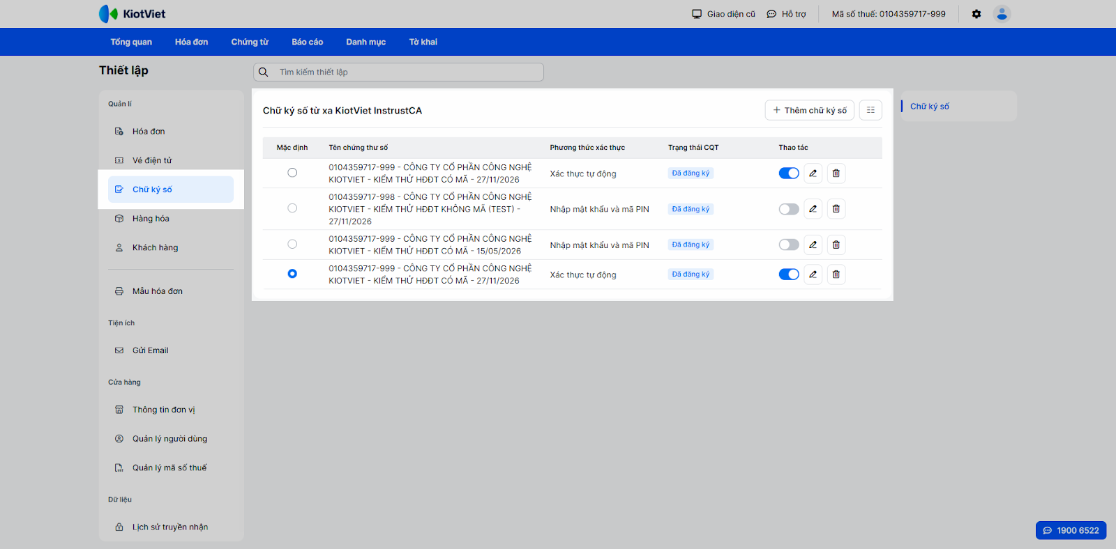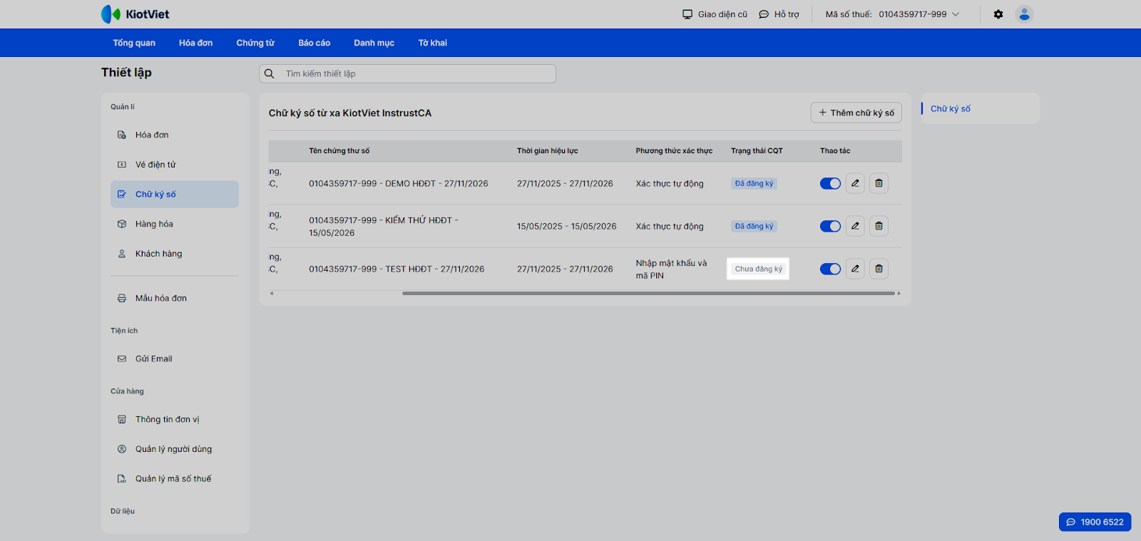 - Thêm các chữ ký số đang chờ đăng ký: Hệ thống tự động điền thông tin của CKS có Trạng thái CQT → Chưa đăng ký trong danh sách Thiết lập → Chữ ký số.