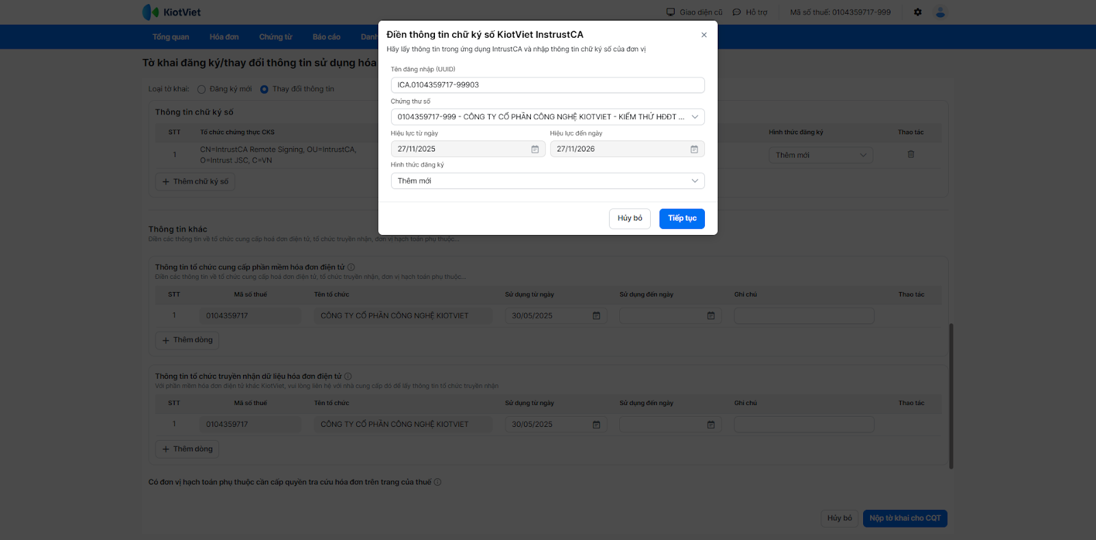 - Bạn điền thông tin Tên đăng nhập (UUID) được IntrustCA cấp → nhấn enter → hệ thống tự động điền các thông tin Chứng thư số, Hiệu lực từ ngày, Hiệu lực đến ngày. Bạn chọn hình thức đăng ký → nhấn Tiếp tục.