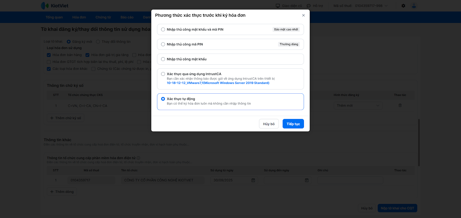 - Chọn 1 trong 5 phương thức xác thực trước khi ký hóa đơn.
