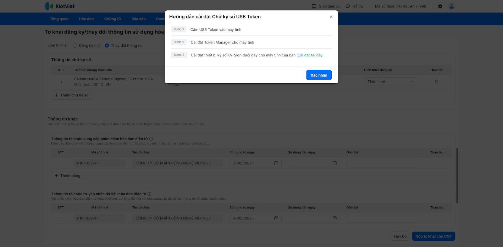 - Chữ ký USB token: Bạn thao tác cài đặt theo 3 bước hướng dẫn trên màn hình → nhấn Xác nhận: