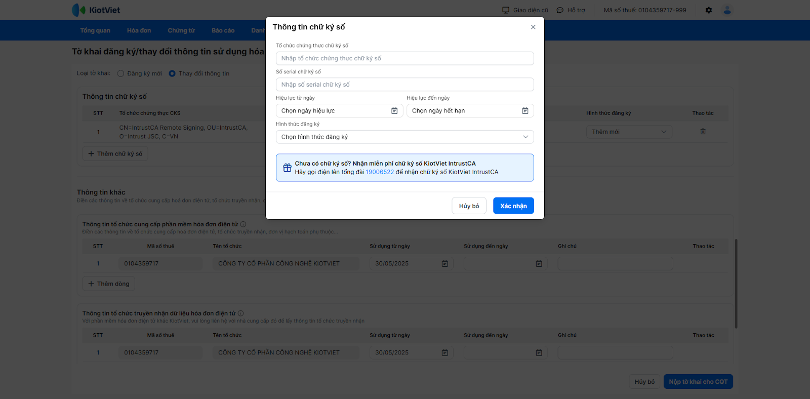 - Tình huống: Khai báo chữ ký số (CKS) mà cửa hàng sẽ sử dụng để ký hóa đơn điện tử.