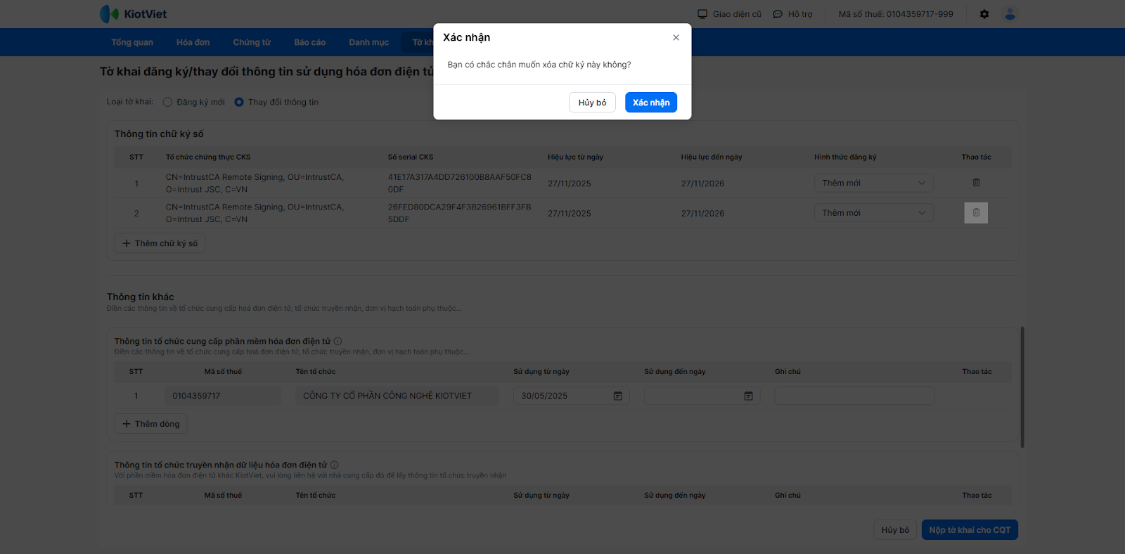 - Nhấn biểu tượng thùng rác → chọn Xác nhận để xóa các dòng chữ ký số bạn tự thêm nếu thao tác sai.