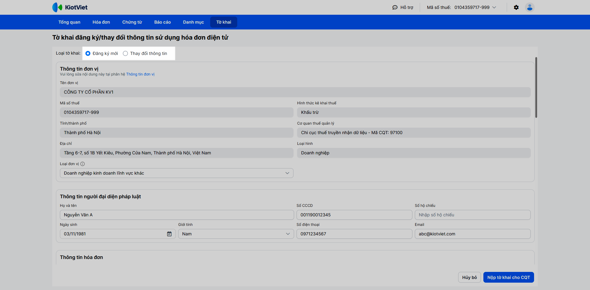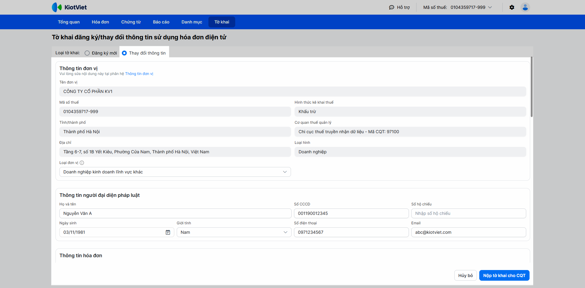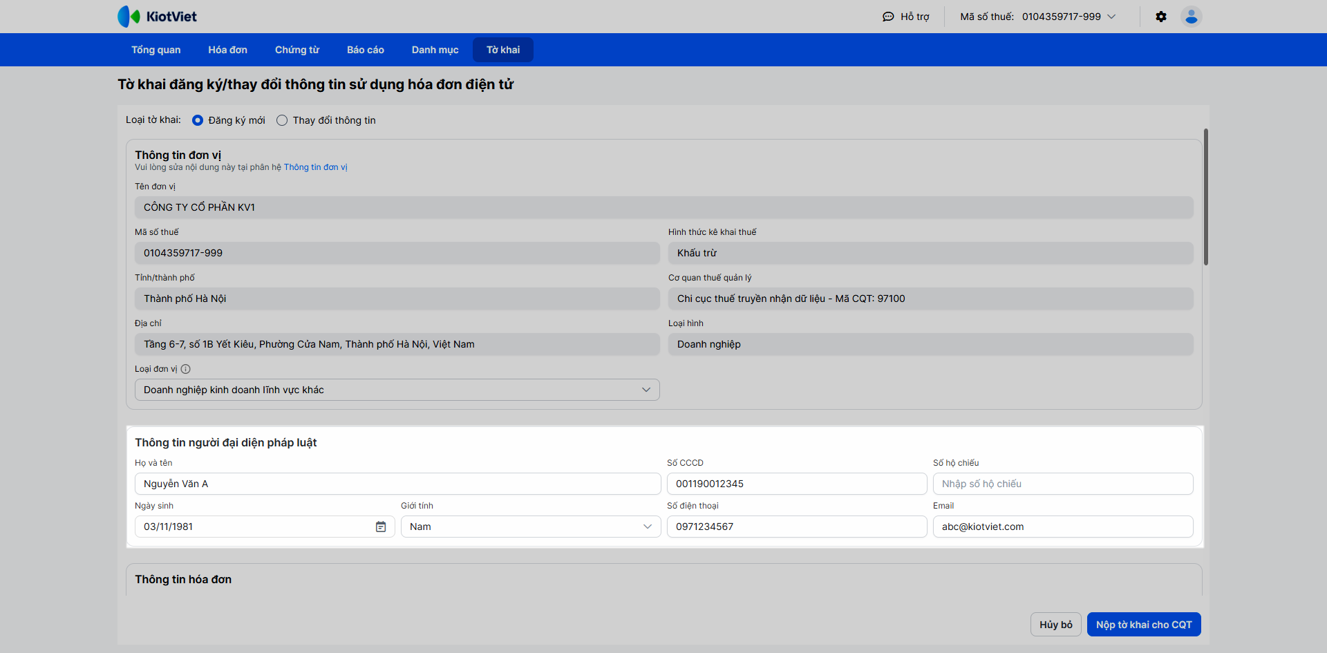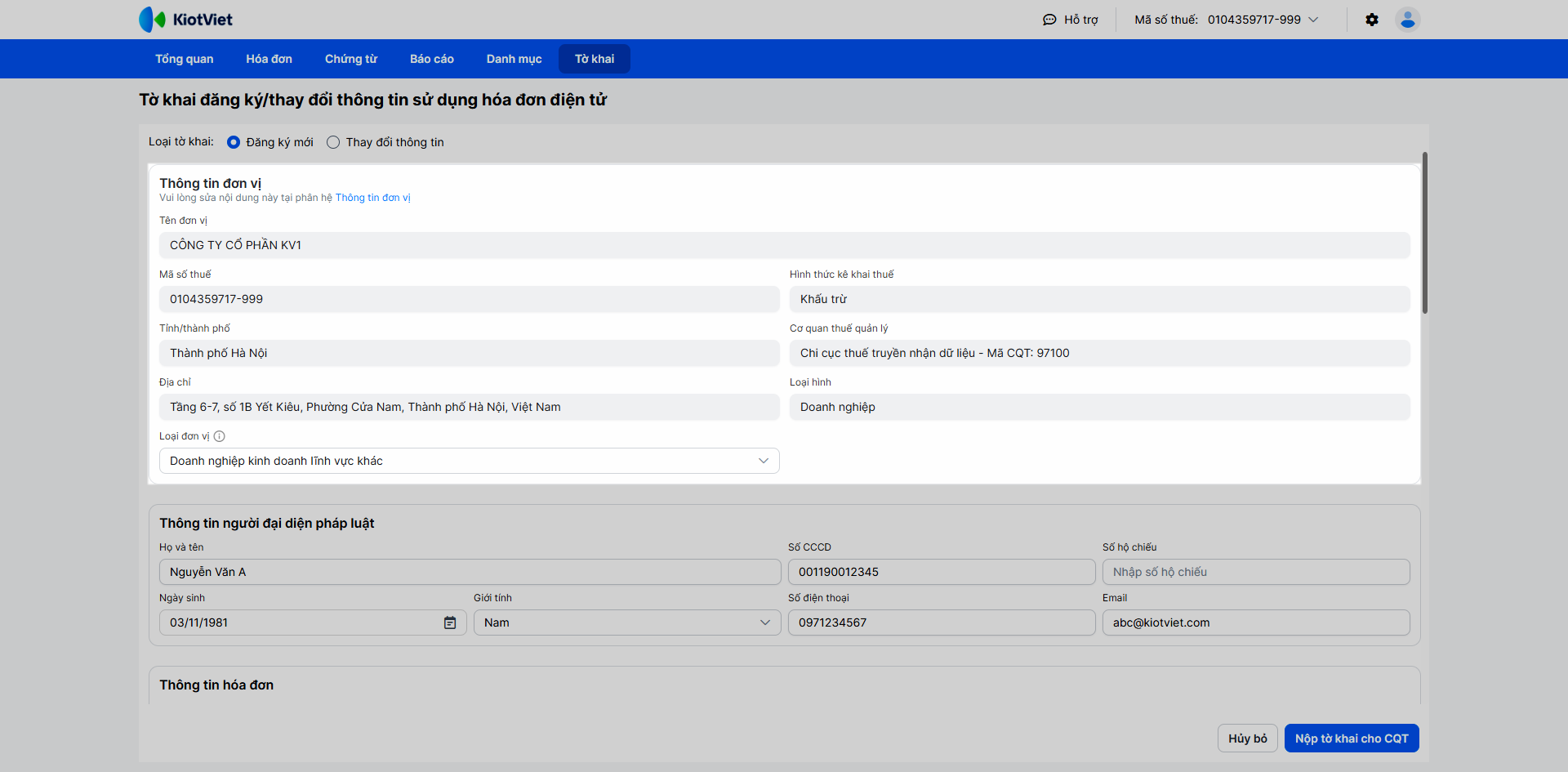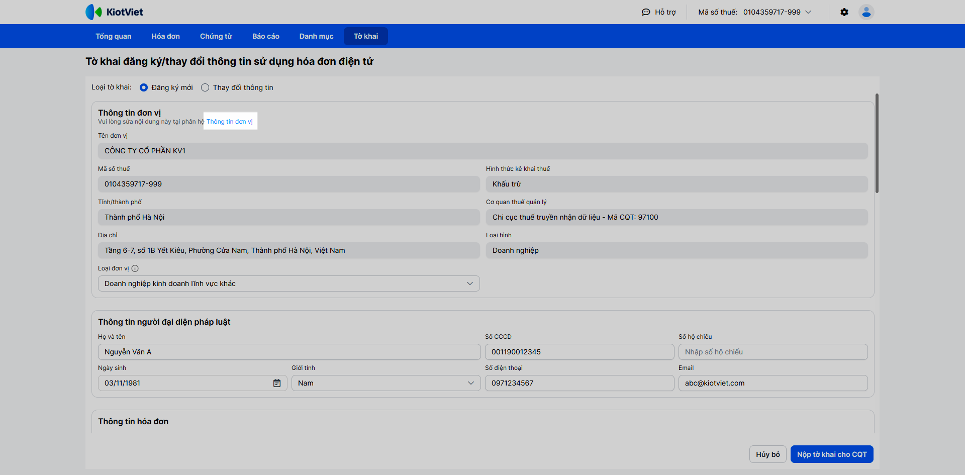 - Kiểm tra phần Thông tin đơn vị đã được tự động điền, bao gồm: