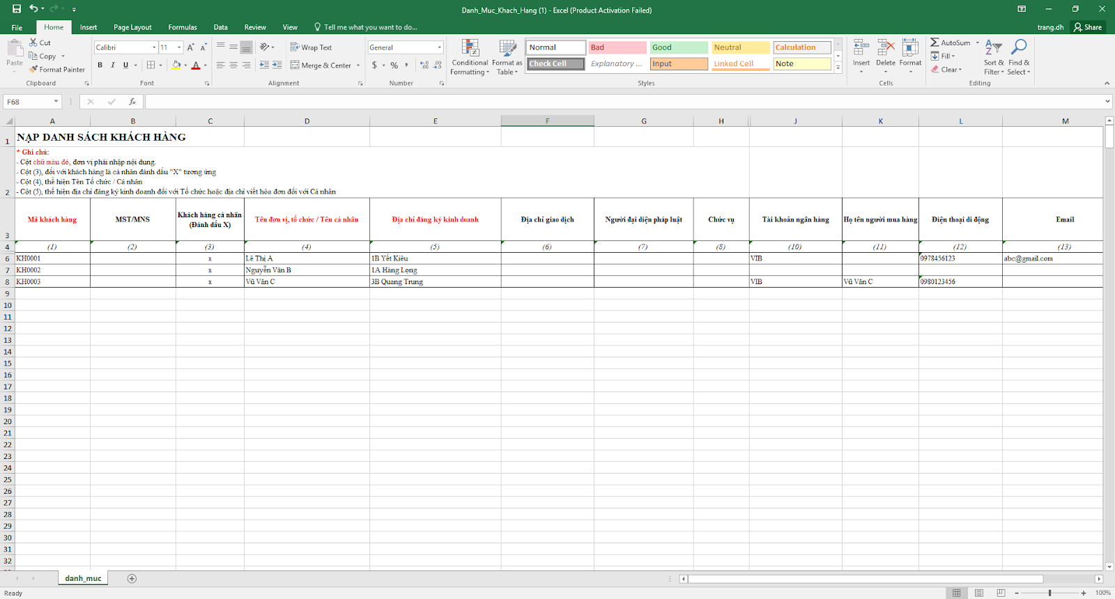 - Mã khách hàng: Là mã duy nhất, không trùng lặp trong hệ thống.